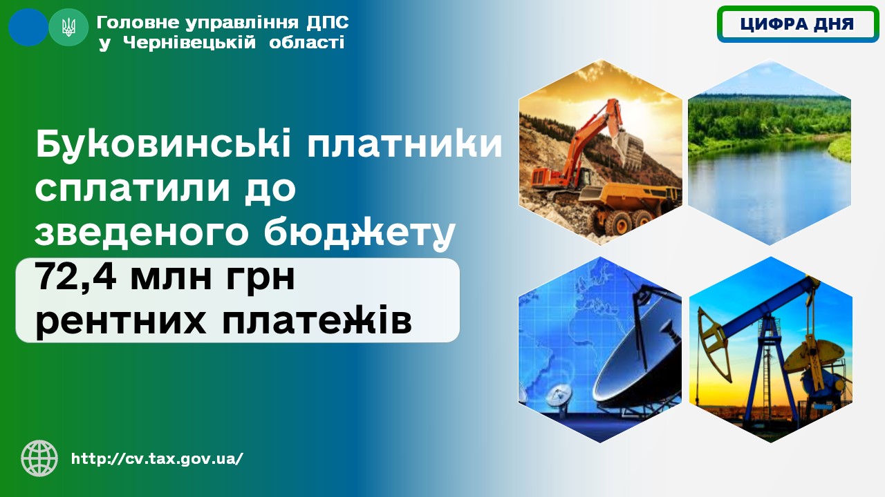 У Головному управлінні ДПС у Чернівецькій області інформують за підсумками січня – вересня 2025 року буковинські платники податків перерахували до бюджетів всіх рівнів понад 72,4 млн грн рентних платежів, що на 7 млн грн більше, ніж в аналогічному періоді минулого року.