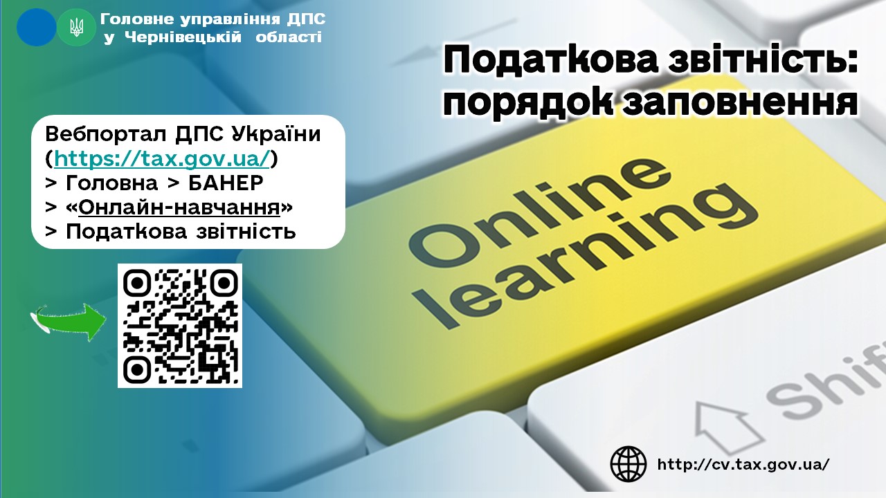 Фахівці Головного управління ДПС у Чернівецькій області інформують, для зручності платників на вебпорталі ДПС України розміщений банер "Онлайн - навчання" https://tax.gov.ua/baneryi/onlayn-navchannya, в якому платники самостійно можуть ознайомитись з актуальною інформацією щодо заповнення податкових звітів.