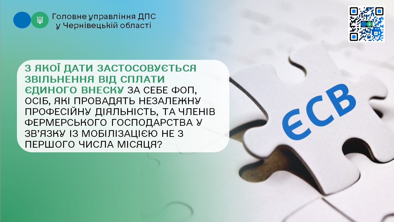 Фахівці Головного управління ДПС у Чернівецькій області звертають увагу, відповідно до п. 9 прим. 2 розд. VIII «Прикінцеві та перехідні положення» Закону України від 08 липня 2010 року № 2464-VI «Про збір та облік єдиного внеску на загальнообов’язкове державне соціальне страхування» (далі – Закон № 2464) під час особливого періоду, визначеного Законом України від 21 жовтня 1993 року № 3543-ХІІ «Про мобілізаційну підготовку та мобілізацію» із змінами та доповненнями (далі – Закон № 3543), платники єдиного внеску на загальнообов’язкове державне соціальне страхування (далі – єдиний внесок), визначені пп. 4 (фізичні особи – підприємці, у тому числі фізичні особи підприємці на спрощеній системі оподаткування), 5 (особи, які провадять незалежну професійну діяльність), та 5 прим. 1 (члени фермерського господарства, якщо вони не належать до осіб, які підлягають страхуванню на інших підставах) частини першої ст. 4 Закону № 2464, призвані на військову службу під час мобілізації або залучені до виконання обов’язків щодо мобілізації за посадами, передбаченими штатами воєнного часу, або за контрактом на весь строк їх військової служби звільняються від виконання своїх обов’язків, визначених частиною другою ст. 6 Закону № 2464, якщо вони не є роботодавцями.