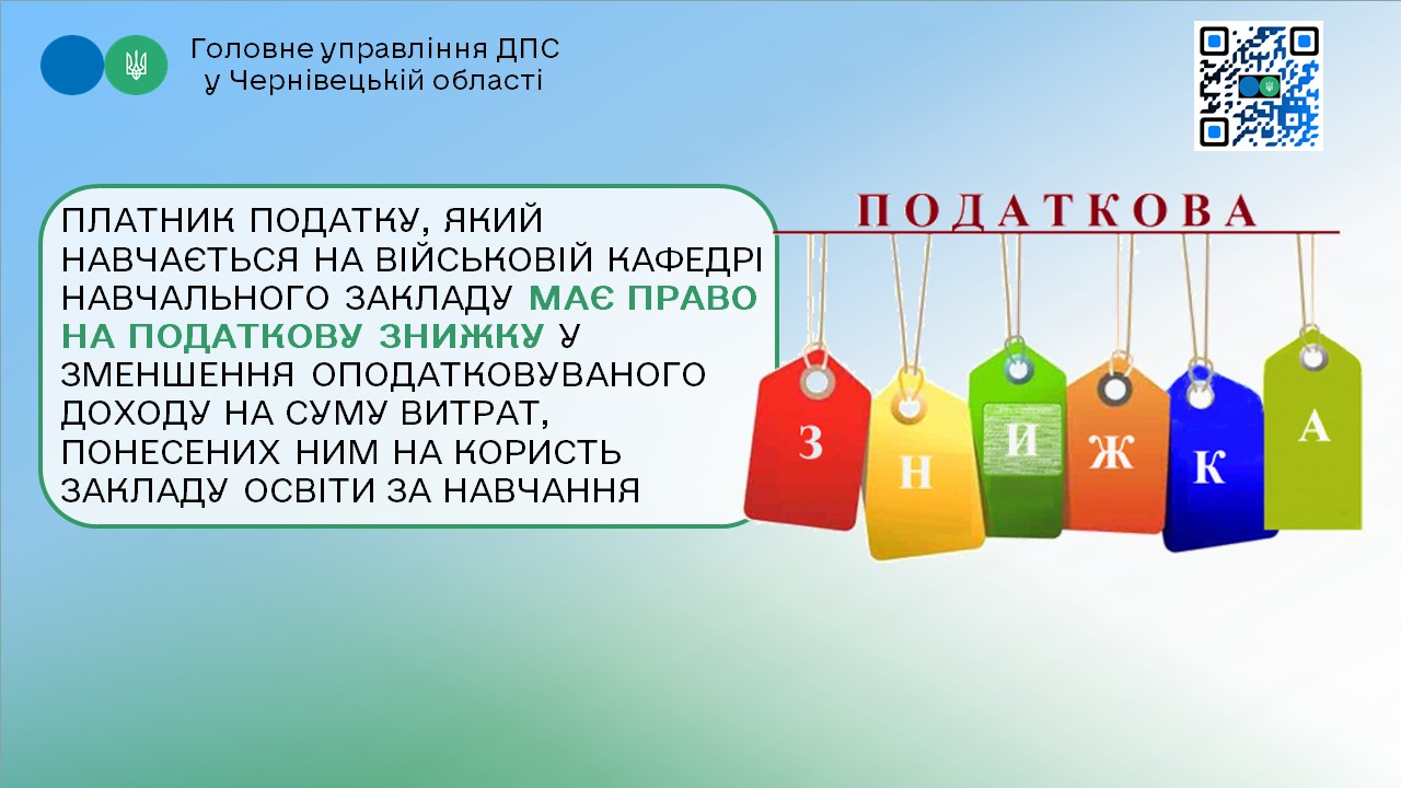 Враховуючи викладене, платник податку, який навчається на військовій кафедрі навчального закладу, є здобувачем професійної військової освіти, тому має право на податкову знижку у зменшення оподатковуваного доходу за наслідками звітного податкового року на суму витрат, понесених ним на користь закладу освіти за навчання на військовій кафедрі.