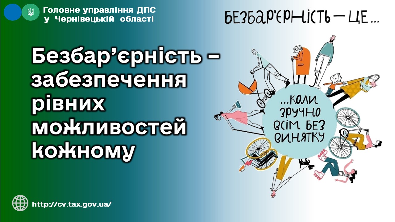 У Головному управлінні ДПС у Чернівецькій області інформують, що відповідно до Національної стратегії із створення безбар’єрного простору в Україні на період до 2030 року візія напряму суспільної та громадянської безбар’єрності – забезпечення рівних можливостей участі всіх людей, їх об’єднань та окремих суспільних груп у житті територіальних громад та держави, рівний доступ до суспільно-політичного та культурного життя, сприятливе середовище для фізичного розвитку та самореалізації, а також інклюзивне середовище як передумова для участі у всіх формах суспільного життя та громадської активності.