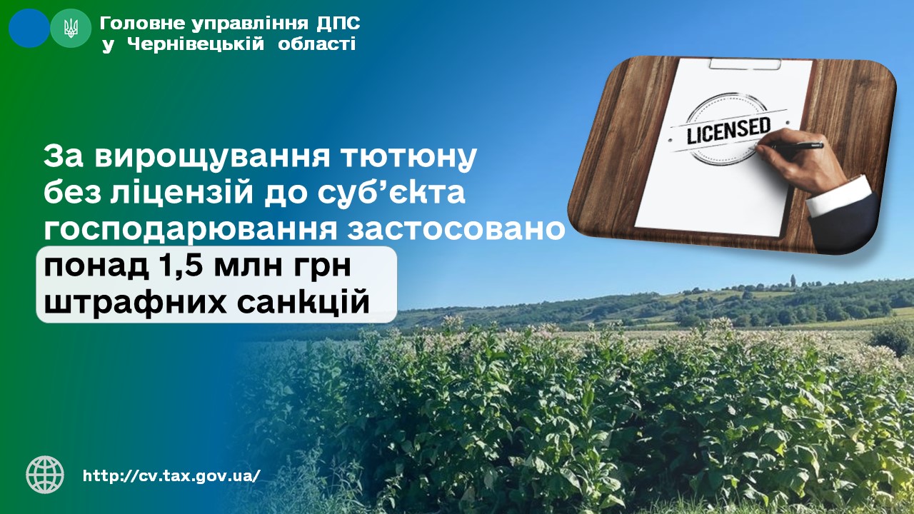 За вирощування тютюну без ліцензій до суб’єкта господарювання застосовано понад 1,5 млн грн штрафних санкцій
