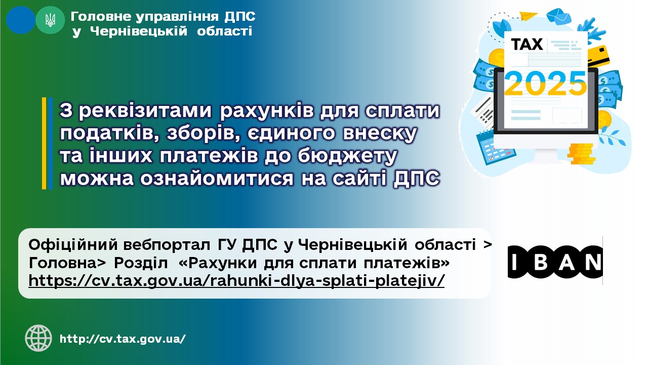 Фахівці Головного управління ДПС у Чернівецькій області нагадують, своєчасне доведення платникам податків реквізитів рахунків для сплати податків, зборів та платежів, відкритих Державною казначейською службою України, відбувається шляхом їх розміщення в Центрах обслуговування платників податків, на офіційному вебпорталі відповідного територіального органу ДПС або на вебпорталі ДПС за посиланням: Головна/Рахунки для сплати платежів (https://tax.gov.ua/rahunki-dlya-splati-platejiv/).