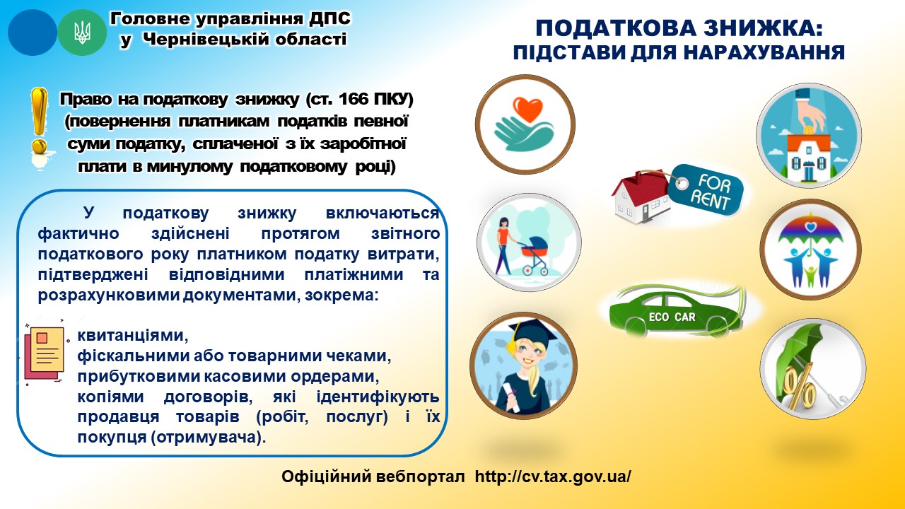 Фахівці Головного управління ДПС у Чернівецькій області нагадують громадянам про можливість скористатися податковою знижкою. Це право передбачено для платників податку на доходи фізичних осіб (ПДФО), які протягом року здійснювали витрати, що підлягають компенсації з бюджету. Документи на отримання податкової знижки за витратами 2024 року можна подавати до 31 грудня 2025 року.