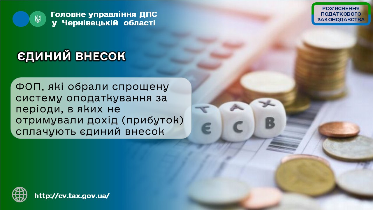 Фахівці Головного управління ДПС у Чернівецькій області нагадують, що відповідно до п. 4 частини першої ст. 4 Закону України від 08 липня 2010 року № 2464-VI «Про збір та облік єдиного внеску на загальнообов’язкове державне соціальне страхування» (далі – Закон № 2464) платниками єдиного внеску на загальнообов’язкове державне соціальне страхування (далі – єдиний внесок) є фізичні особи – підприємці, в тому числі фізичні особи – підприємці, які обрали спрощену систему оподаткування (крім електронних резидентів (е-резидентів).