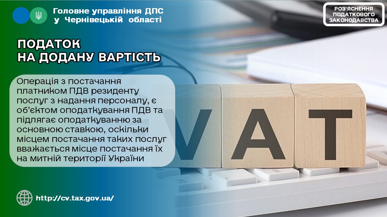 У Головному управлінні ДПС у Чернівецькій області роз’яснюють про порядок оподаткування операції з постачання платником ПДВ резиденту/нерезиденту послуг з надання персоналу.