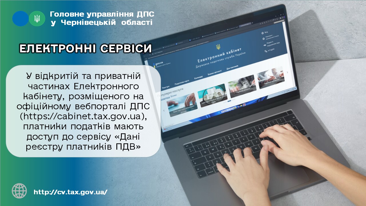 У відкритій та приватній частинах Електронного кабiнету, розміщеного на офіційному вебпорталі ДПС (https://cabinet.tax.gov.ua), платники податків мають доступ, зокрема до сервісу «Дані реєстру платників ПДВ».