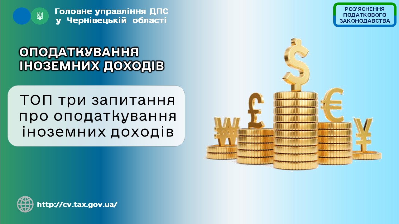 Фахівці Головного управління ДПС у Чернівецькій області нагадують, що відповідно до підпунктів 170.11.1 та 170.11.2 п. 170.11 ст. 170 Податкового кодексу України від 02 грудня 2010 року № 2755-VI із змінами та доповненнями (далі – ПКУ) у разі якщо джерело виплат будь-яких оподатковуваних доходів є іноземним, сума такого доходу включається до загального річного оподатковуваного доходу платника податку – отримувача, який зобов’язаний подати річну податкову декларацію про майновий стан і доходи (далі – Декларація), та оподатковується за ставкою, визначеною п. 167.1 ст. 167 ПКУ (18 відс.), крім: