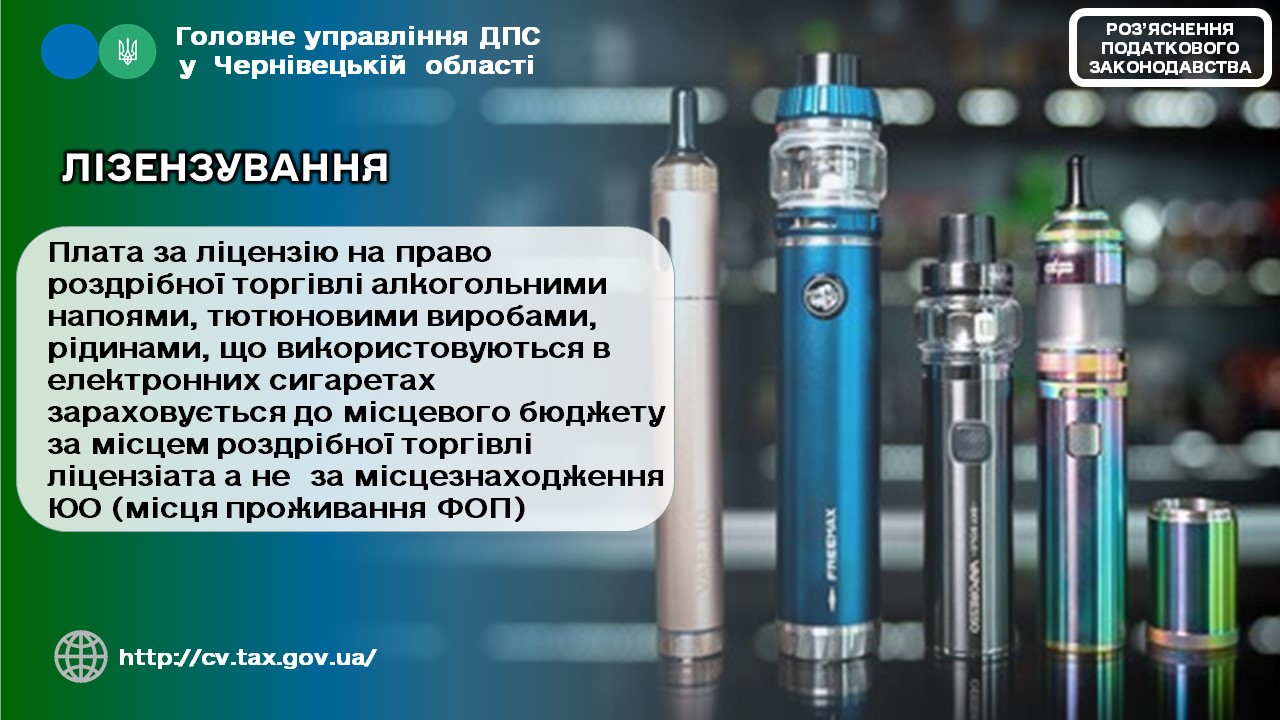 Фахівці Головного управління ДПС у Чернівецькій області нагадують, що відповідно до ст. 52 Закону України від 18 червня 2024 року № 3817-ІХ «Про державне регулювання виробництва і обігу спирту етилового, спиртових дистилятів, біоетанолу, алкогольних напоїв, тютюнових виробів, тютюнової сировини, рідин, що використовуються в електронних сигаретах, та пального» ліцензії на право роздрібної торгівлі алкогольними напоями, тютюновими виробами, рідинами, що використовуються в електронних сигаретах, надаються органами ліцензування за кожним місцем роздрібної торгівлі заявника або центральним органом виконавчої влади, що реалізує державну податкову політику, – у разі надання в автоматичному режимі ліцензії на право роздрібної торгівлі алкогольними напоями, тютюновими виробами, рідинами, що використовуються в електронних сигаретах.