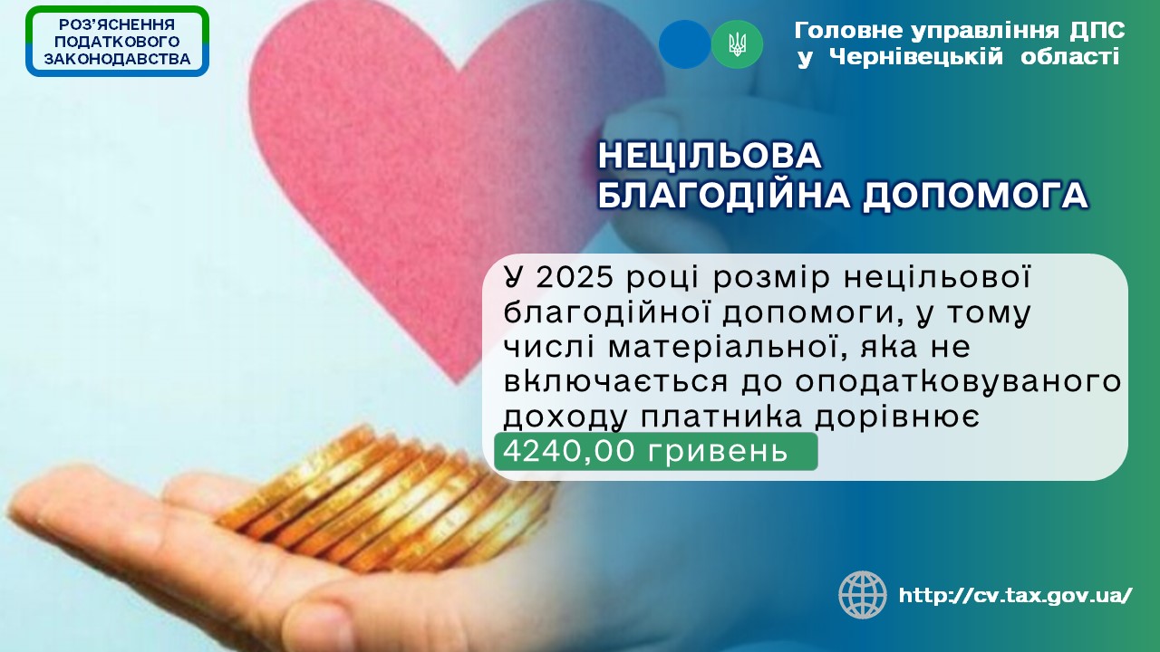 У Головному управлінні ДПС у Чернівецькій області інформують, відповідно до п.п. 170.7.3 п. 170.7 ст. 170 розд. IV Податкового кодексу України від 02 грудня 2010 року № 2755-VI із змінами та доповненнями (далі – ПКУ) не включається до оподатковуваного доходу сума нецільової благодійної допомоги, у тому числі матеріальної, що надається резидентами – юридичними або фізичними особами на користь платника податку протягом звітного податкового року сукупно у розмірі, що не перевищує суми граничного розміру доходу, визначеного згідно з абзацом першим п.п. 169.4.1 п. 169.4 ст. 169 ПКУ, встановленого на 1 січня такого року (у 2022 році – 3470,00 грн., у 2023 році – 3760,00 грн., у 2024 році – 4240,00 грн., у 2025 році – 4240,00 гривень).
