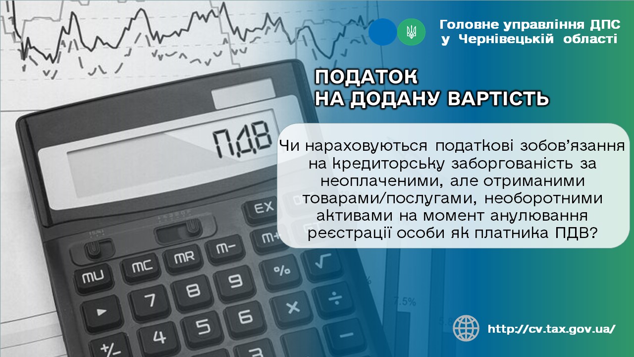 Фахівці Головного управління ДПС у Чернівецькій області роз’яснюють,  відповідно до п. 184.7 ст. 184 Податкового кодексу України від 02 грудня 2010 року № 2755-VI (далі – ПКУ) якщо товари/послуги, необоротні активи, суми податку по яких були включені до складу податкового кредиту, не були використані в оподатковуваних операціях у межах господарської діяльності, такий платник податку в останньому звітному (податковому) періоді не пізніше дати анулювання його реєстрації як платника податку зобов’язаний визначити податкові зобов’язання по таких товарах/послугах, необоротних активах виходячи із звичайної ціни відповідних товарів/послуг чи необоротних активів, крім випадків анулювання реєстрації як платника податку внаслідок реорганізації платника податку шляхом приєднання, злиття, перетворення, поділу та виділення відповідно до закону.
