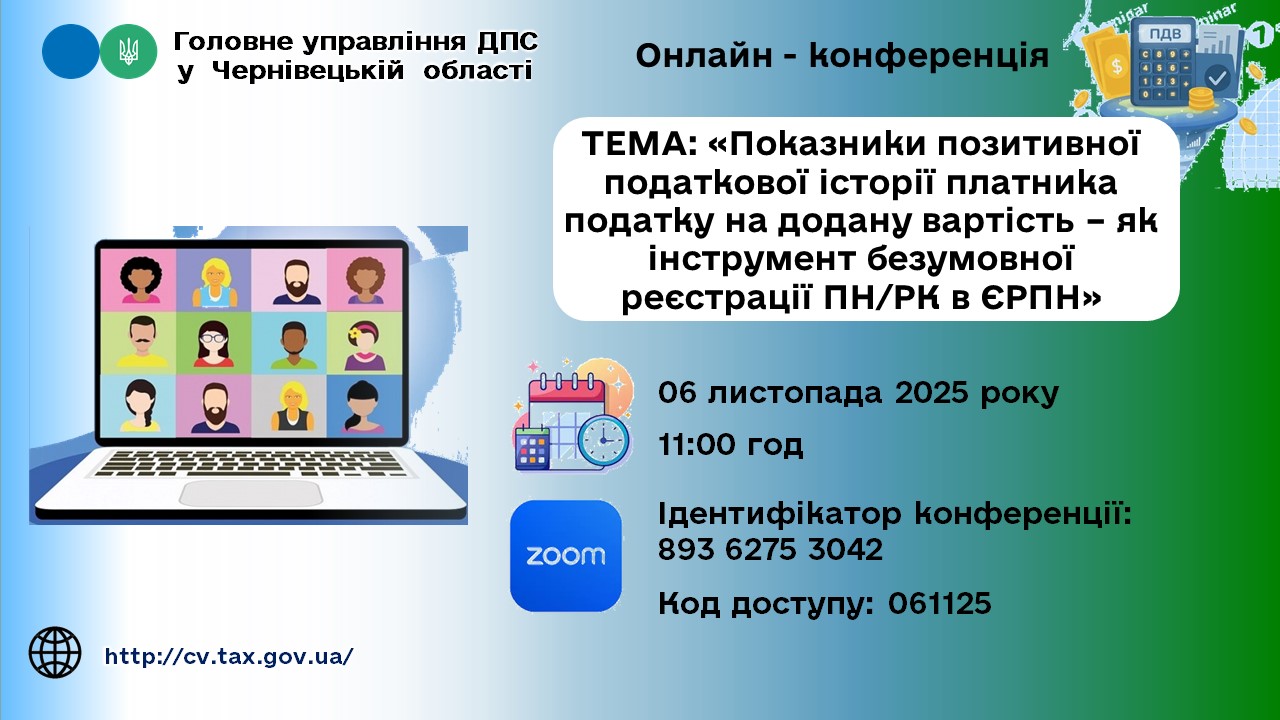 Головне управління ДПС у Чернівецькій області проведе в режимі ZOOM конференцію на тему: «Показники позитивної податкової історії платника податку на додану вартість – як інструмент безумовної реєстрації ПН/РК в ЄРПН».
