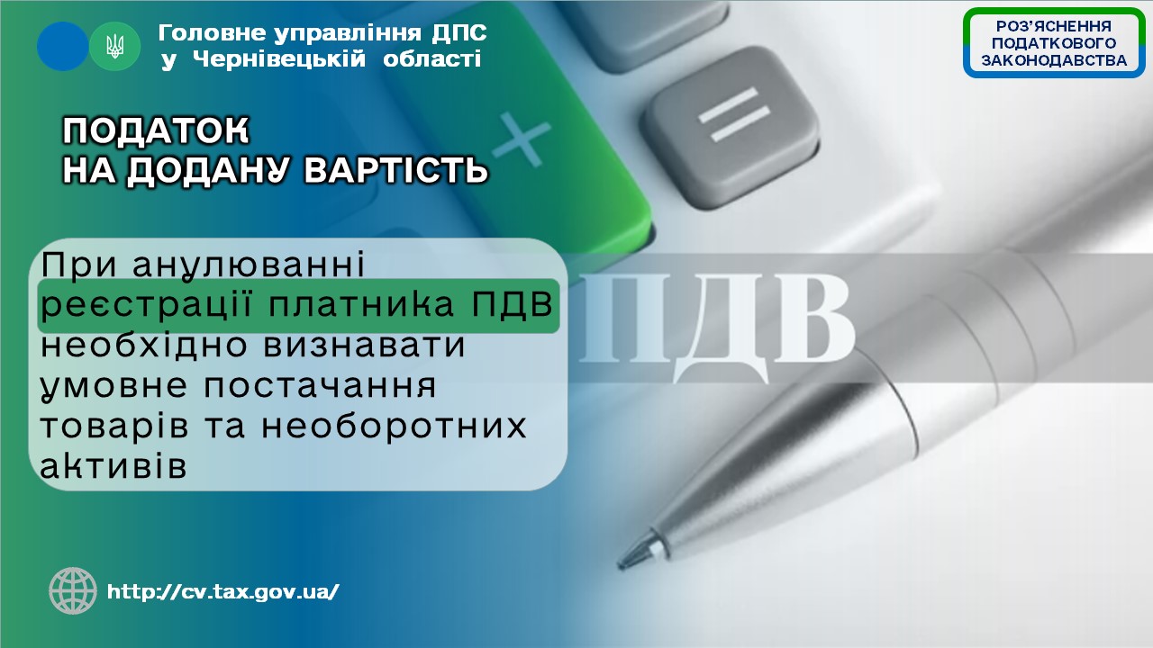 У Головному управлінні ДПС у Чернівецькій області нагадують, що відповідно до п. 184.7 ст.184 Податкового кодексу України від 02 грудня 2010 року №2755-VI із змінами та доповненнями якщо товари/послуги, необоротні активи, суми податку по яких були включені до складу податкового кредиту, не були використані в оподатковуваних операціях у межах господарської діяльності, такий платник податку в останньому звітному (податковому) періоді не пізніше дати анулювання його реєстрації як платника податку зобов’язаний визначити податкові зобов’язання по таких товарах/послугах, необоротних активах виходячи із звичайної ціни відповідних товарів/послуг чи необоротних активів, крім випадків анулювання реєстрації як платника податку внаслідок реорганізації платника податку шляхом приєднання, злиття, перетворення, поділу та виділення відповідно до закону.