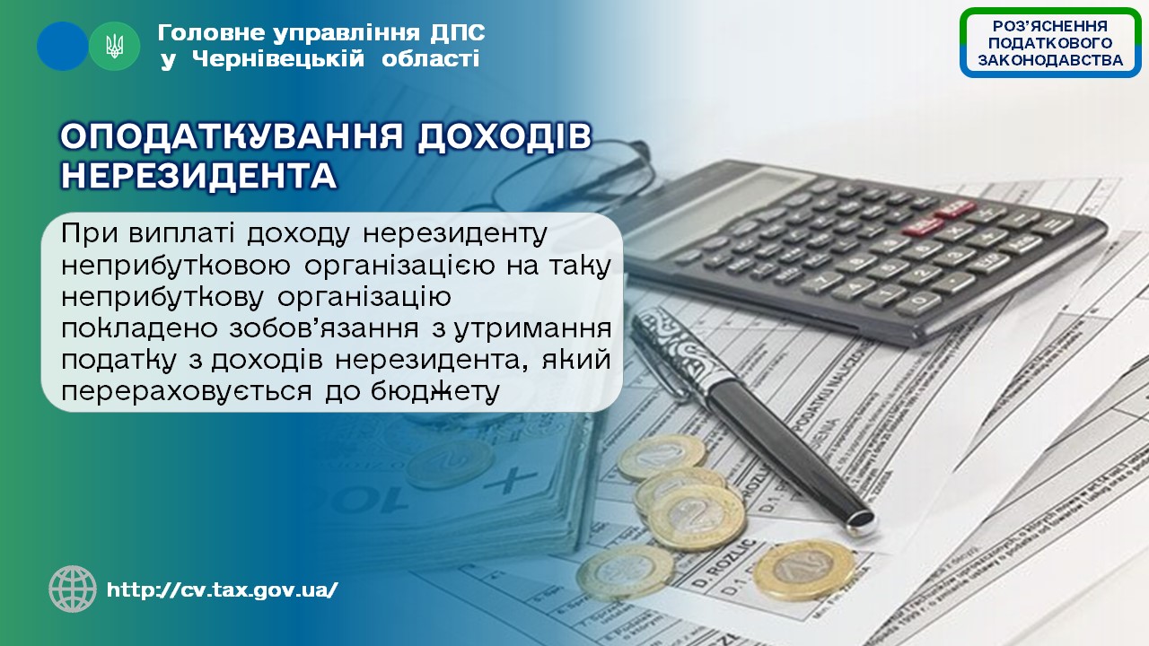 Фахівці Головного управління ДПС у Чернівецькій області нагадують, що відповідно до абзацу першого п.п. 141.4.2 п. 141.4 ст. 141 Податкового кодексу України від 02 грудня 2010 року № 2755-VI зі змінами та доповненнями (далі – ПКУ) резидент, у тому числі фізична особа підприємець, фізична особа, яка провадить незалежну професійну діяльність, або суб’єкт господарювання (юридична особа чи фізична особа підприємець), який обрав спрощену систему оподаткування, або інший нерезидент, який провадить господарську діяльність через постійне представництво на території України, які здійснюють на користь нерезидента або уповноваженої ним особи будь-яку виплату з доходу з джерелом його походження з України, отриманого таким нерезидентом (у тому числі на рахунки нерезидента, що ведуться в національній валюті), утримують податок з таких доходів, зазначених у п.п. 141.4.1 п. 141.4 ст. 141 ПКУ, за ставкою в розмірі 15 відс. (крім доходів, зазначених у підпунктах 141.4.3 –141.4.5 та 141.4.11 п. 141.4 ст. 141 ПКУ) їх суми та за їх рахунок, що сплачується до бюджету під час такої виплати, якщо інше не передбачено положеннями міжнародних договорів України з країнами резиденції осіб, на користь яких здійснюються виплати, що набрали чинності. Вимоги цього абзацу не застосовуються до доходів нерезидентів, що отримуються ними через їх постійні представництва на території України.