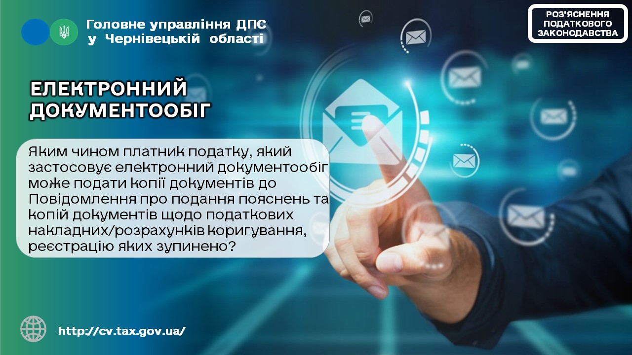 У Головному управлінні ДПС у Чернівецькій області нагадують, що письмові пояснення та копії документів, платник податку подає до ДПС в електронній формі за допомогою засобів електронного зв’язку з урахуванням вимог Законів України від 22 травня 2003 року № 851-IV «Про електронні документи та електронний документообіг» (далі – Закон № 851), від 05 жовтня 2017 року № 2155-VІІІ «Про електронну ідентифікацію та електронні довірчі послуги» (далі – Закон № 2155) та Порядку обміну електронними документами з контролюючими органами, затвердженого наказом Міністерства фінансів України від 06.06.2017 № 557, зареєстрованого у Міністерстві юстиції України 03.08.2017 за № 959/30827 (зі змінами). ДПС розміщує та постійно оновлює на своєму офіційному вебпорталі відомості щодо засобів електронного зв’язку, за допомогою яких можуть подаватися письмові пояснення та копії документів.