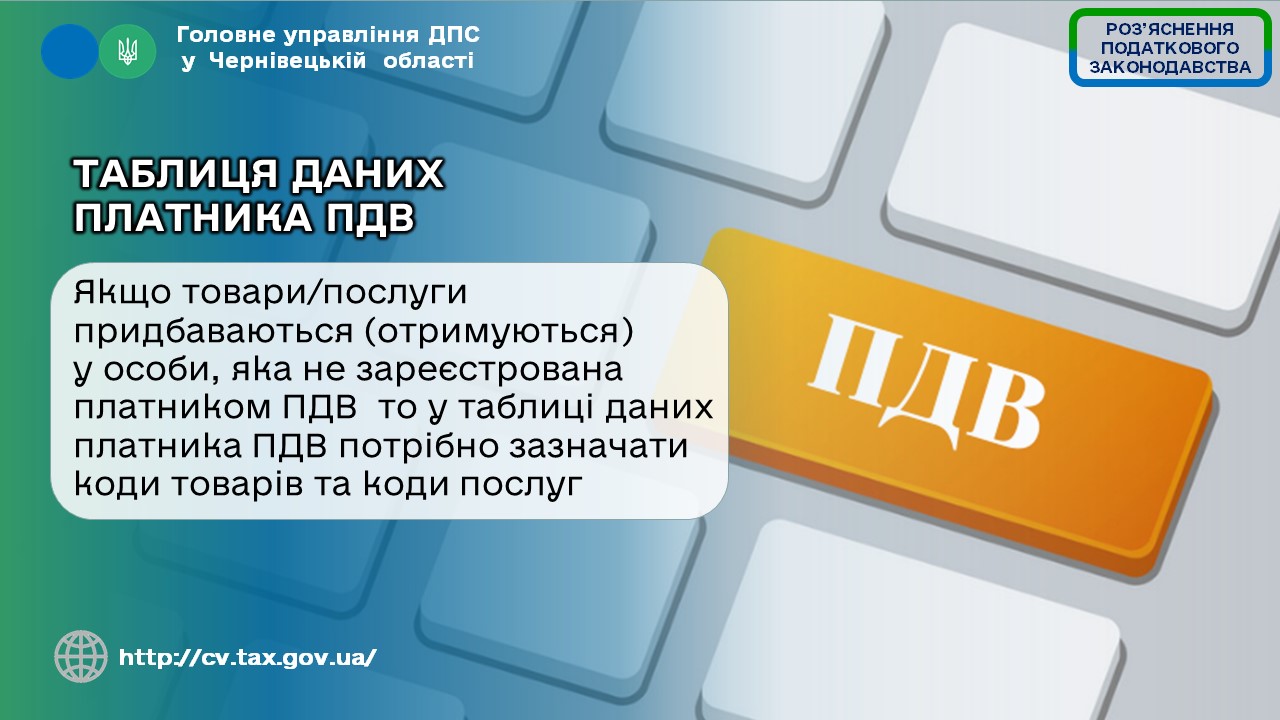 У Головному управлінні ДПС у Чернівецькій області інформують, що відповідно до п. 12 Порядку зупинення реєстрації податкової накладної/розрахунку коригування в Єдиному реєстрі податкових накладних, затвердженого постановою Кабінету Міністрів України від 11 грудня 2019 року № 1165 «Про затвердження порядків з питань зупинення реєстрації податкової накладної/розрахунку коригування в Єдиному реєстрі податкових накладних» (далі – Порядок зупинення) платник податку має право подати до ДПС таблицю даних платника ПДВ (далі – Таблиця) за встановленою формою (додаток 5).