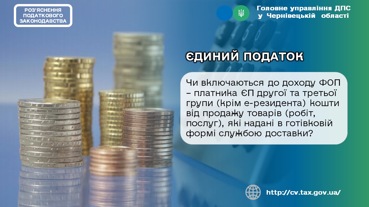 Враховуючи вищенаведене, кошти, отримані платником єдиного податку (другої – третьої груп) (крім е-резидента) від продажу товарів (робіт, послуг), які надані в готівковій формі службою доставки є доходом фізичної особи – підприємця – платника єдиного податку.