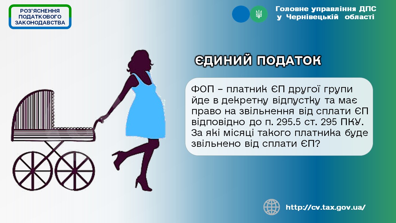 Одночасно, відпустка у зв’язку з вагітністю та пологами згідно з Законом України «Про відпустки» надається жінкам на підставі медичного висновку, а отже у разі підтвердження інформації про непрацездатність відповідним витягом з Електронного реєстру листків непрацездатності платник єдиного податку першої/другої групи, який не використовує працю найманих осіб, звільняється від сплати єдиного податку на цей період, якщо він триває 30 і більше календарних днів. Якщо підтверджений відповідним витягом період непрацездатності розпочався до 20 числа місяця та закінчився у наступному(их) місяці(ях), то такий платник звільняється від сплати єдиного податку за календарний місяць, в якому почався період непрацездатності, та за всі повні календарні місяці, які припадають на цей період непрацездатності (у разі їх наявності), а за календарний місяць, в якому відповідно до даних, зазначених у витязі з Електронного реєстру листків непрацездатності, період непрацездатності закінчився, єдиний податок сплачується відповідно до норм ПКУ.