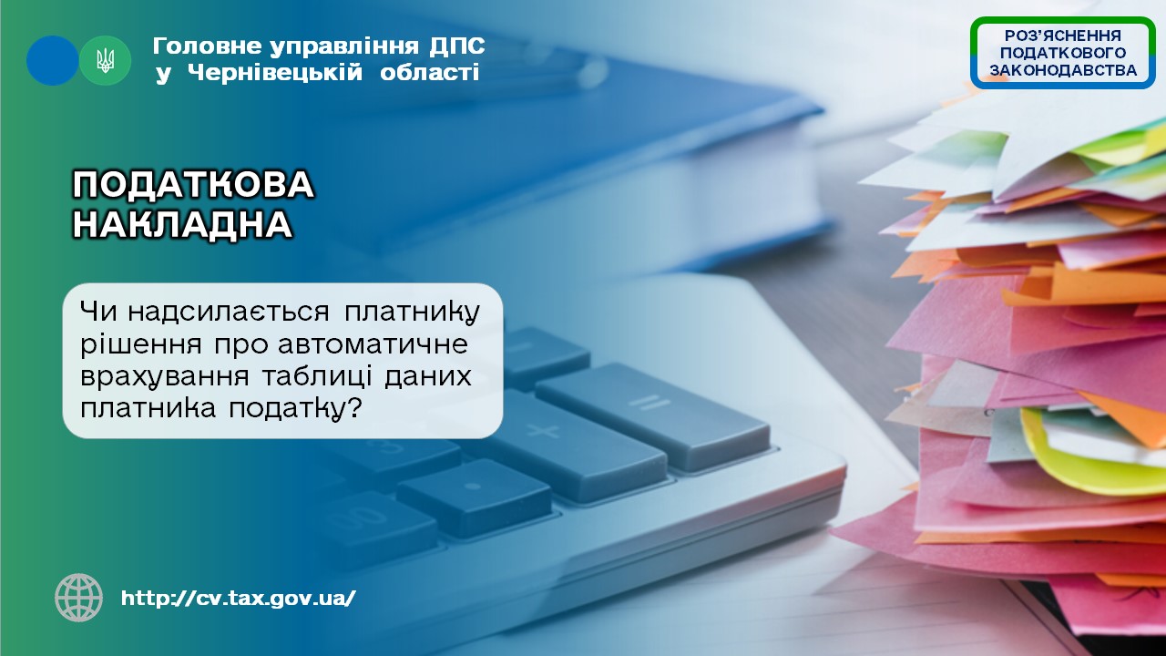 У Головному управлінні ДПС у Чернівецькій області нагадують, відповідно до п. 12 Порядку зупинення реєстрації податкової накладної/розрахунку коригування в Єдиному реєстрі податкових накладних, затвердженого постановою Кабінету Міністрів України від 11 грудня 2019 року № 1165 «Про затвердження порядків з питань зупинення реєстрації податкової накладної/розрахунку коригування в Єдиному реєстрі податкових накладних» (далі – Порядок), платник податку має право подати до ДПС таблицю даних платника ПДВ (далі – Таблиця) за встановленою формою згідно з додатком 5 до Порядку.
