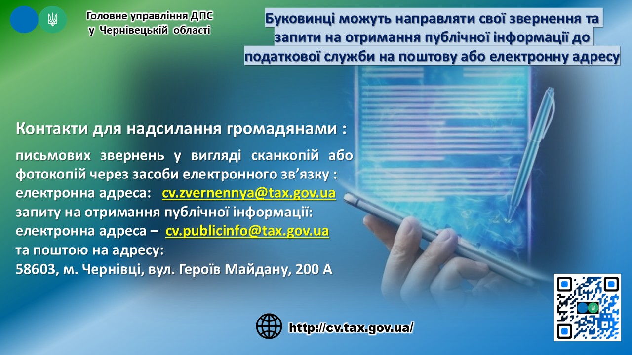 Фахівці Головного управління ДПС у Чернівецькій області нагадують, що відповідно до ст. 40 Конституції України усі мають право направляти індивідуальні чи колективні письмові звернення або особисто звертатися до органів державної влади, органів місцевого самоврядування та посадових і службових осіб цих органів, що зобов’язані розглянути звернення і дати обґрунтовану відповідь у встановлений законом строк.