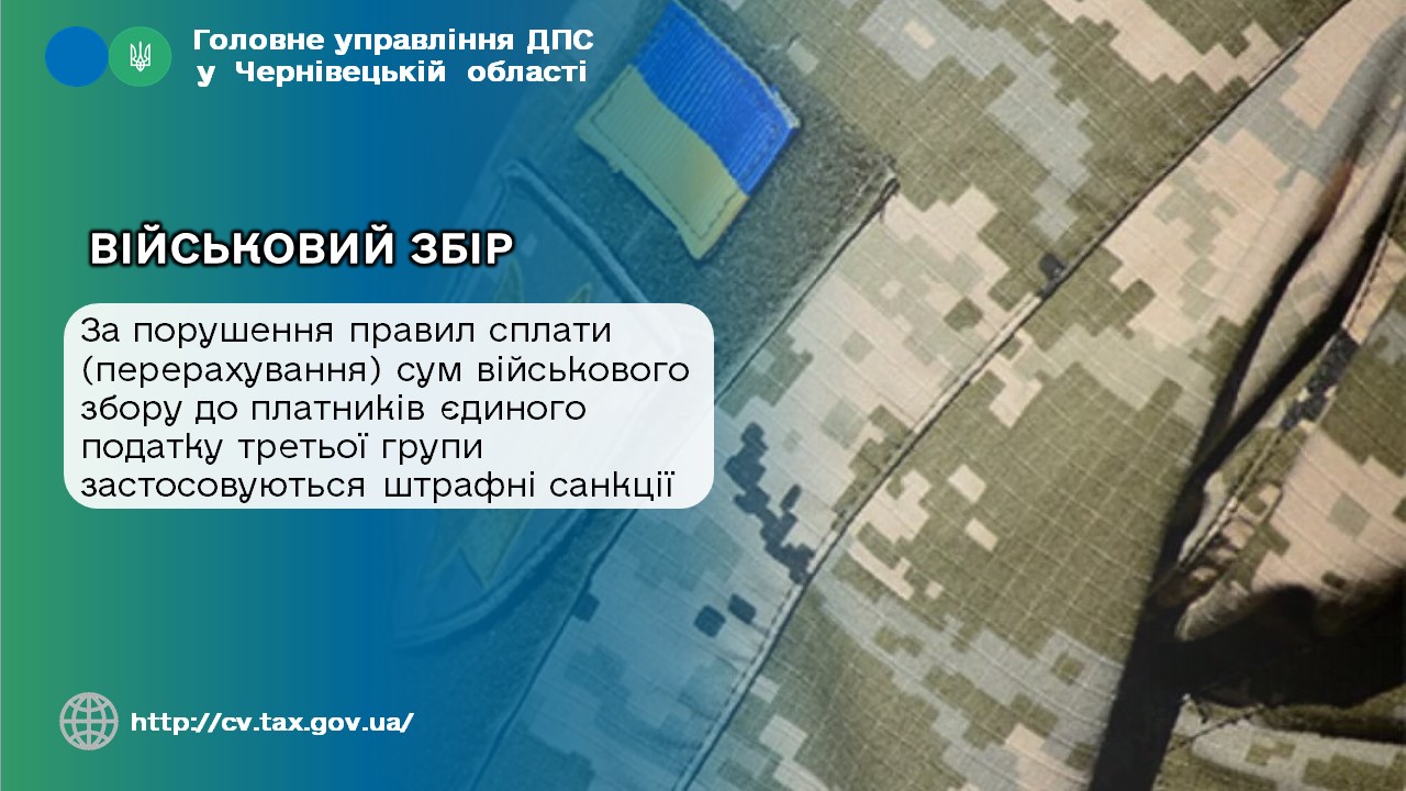 Фахівці Головного управління ДПС у Чернівецькій області нагадують, відповідно до п.п. 3 п.п. 1.1 п. 16 прим. 1 підрозд. 10 розд. XX «Перехідні положення» Податкового кодексу України від 02 грудня 2010 року № 2755-VI (далі – ПКУ) платниками військового збору є платники єдиного податку третьої групи – фізичні особи – підприємці та юридичні особи.