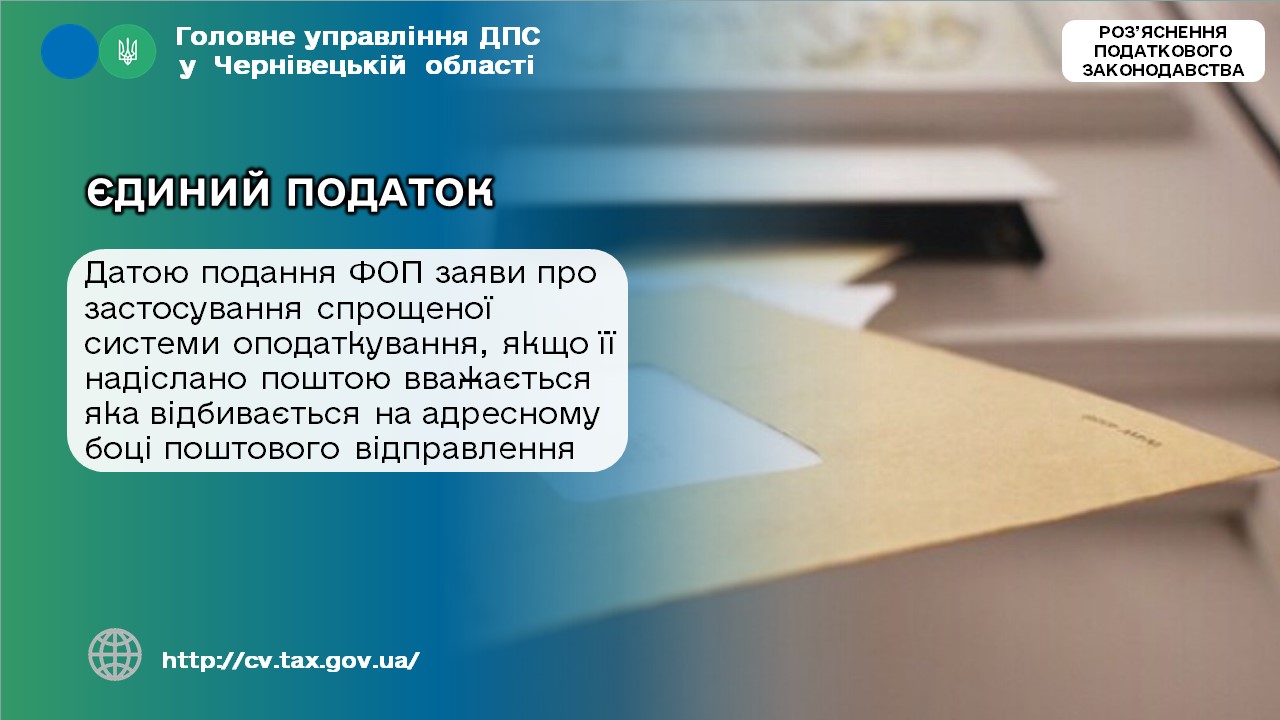 Датою подання ФОП заяви про застосування спрощеної системи оподаткування, якщо її надіслано поштою вважається яка відбивається на адресному боці поштового відправлення