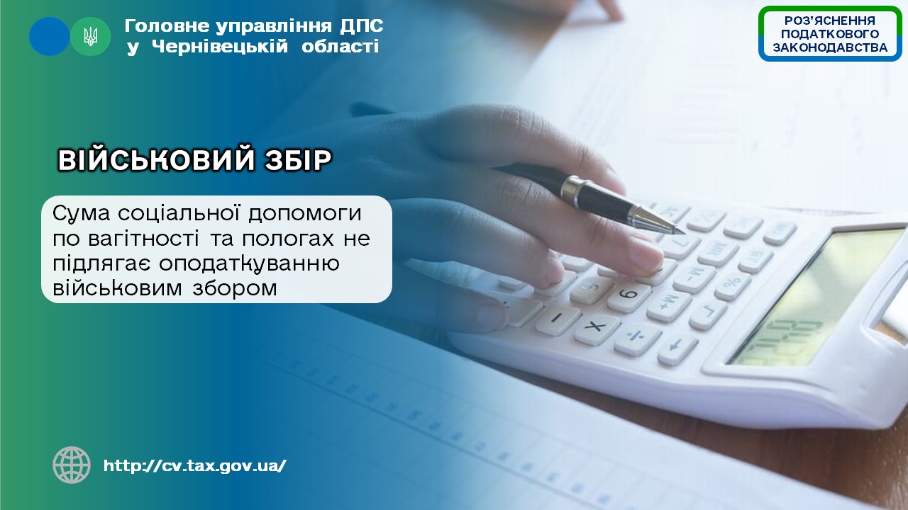 Враховуючи зазначене, оскільки сума соціальної допомоги по вагітності та пологах, яку отримує платник податку з бюджетів та фондів загальнообов’язкового державного соціального страхування, не включається до його загального місячного (річного) оподатковуваного доходу, така сума не підлягає оподаткуванню військовим збором.