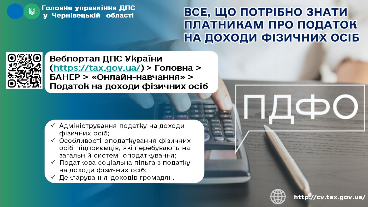 Фахівці Головного управління ДПС у Чернівецькій області інформують, для зручності платників на вебпорталі ДПС України розміщений банер "Онлайн - навчання" https://tax.gov.ua/baneryi/onlayn-navchannya, в якому платники самостійно можуть ознайомитись з актуальною інформацією щодо адміністрування податок на доходи фізичних осіб.