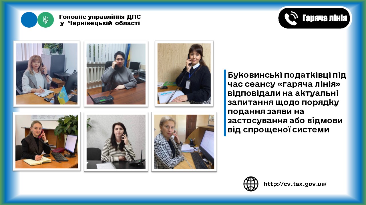 Провідні фахівці центрів обслуговвання платників Головного управління ДПС у Чернівецькій області провели анонсований сеанс телефоного зв'язку «гаряча лінія» під час якої розповіли про порядок та терміни подання Заяви про застосування спрощеної системи оподаткування.