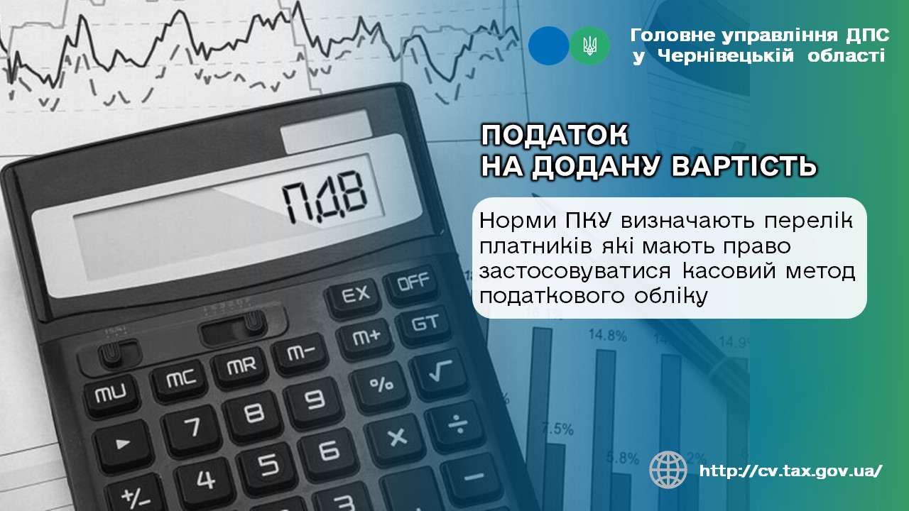 У Головному управлінні ДПС у Чернівецькій області роз'яснюють, згідно з п.п. 14.1.266 п. 14.1 ст. 14 Податкового кодексу України від 02 грудня 2010 року № 2755-VI зі змінами та доповненнями (далі – ПКУ) касовий метод для цілей оподаткування згідно з розд. V ПКУ – метод податкового обліку, за яким дата виникнення податкових зобов’язань визначається як дата зарахування (отримання) коштів на рахунки платника податку в банку / небанківському надавачу платіжних послуг, на електронний гаманець у емітента електронних грошей та/або на рахунки в органах, що здійснюють казначейське обслуговування бюджетних коштів, у касу платника податків або дата отримання інших видів компенсацій вартості поставлених (або тих, що підлягають поставці) ним товарів (послуг), а дата віднесення сум податку до податкового кредиту визначається як дата списання коштів з рахунків платника податку в банку / небанківському надавачу платіжних послуг, з електронних гаманців у емітента електронних грошей та/або з рахунків в органах, що здійснюють казначейське обслуговування бюджетних коштів, дата видачі з каси платника податків або дата надання інших видів компенсацій вартості поставлених (або тих, що підлягають поставці) йому товарів (послуг).