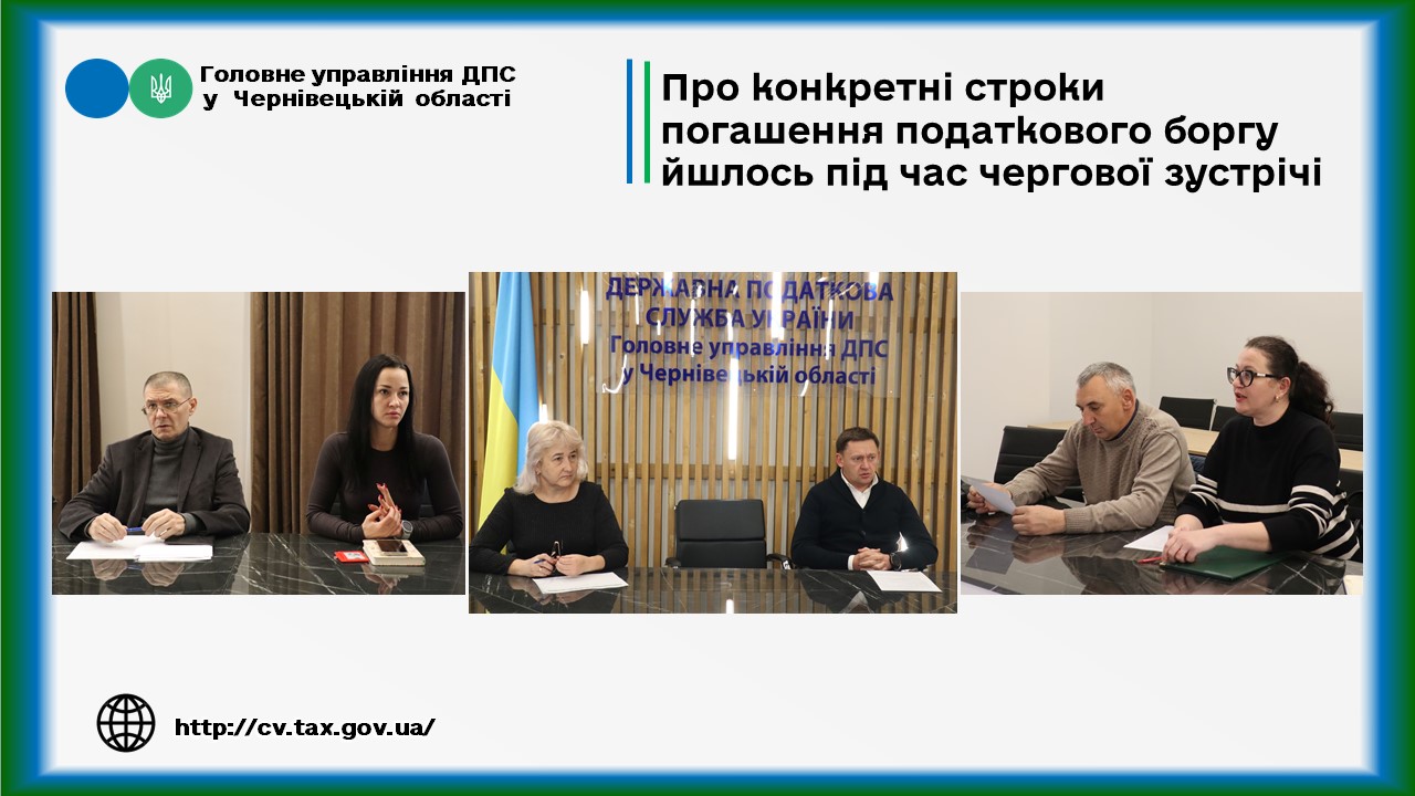 Сьогодні, за участі заступника Головного управління ДПС у Чернівецькій області Володимира Петковича та фахівців управління по роботі з податковим відбулась робоча зустріч з представником КП «Сторожинецьке житлово-комунальне господарство» борг якого склав понад 8,7 млн грн, зокрема заборгованість:з податку на додану вартість - 5,1 млн грн; з податку на доходи фізичних осіб – 3,4 млн грн; військовий збір – 0,2 млн грн.