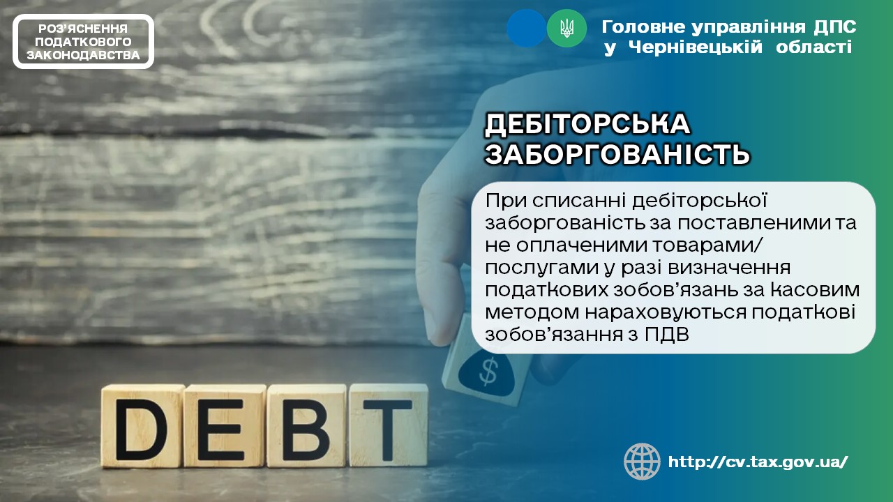 Отже, платник податку, який застосовує касовий метод визначення податкових зобов’язань, на дату списання простроченої дебіторської заборгованості за поставлені та не оплачені товари (послуги) повинен нарахувати податкові зобов’язання з ПДВ за операцією з постачання таких товарів (послуг).