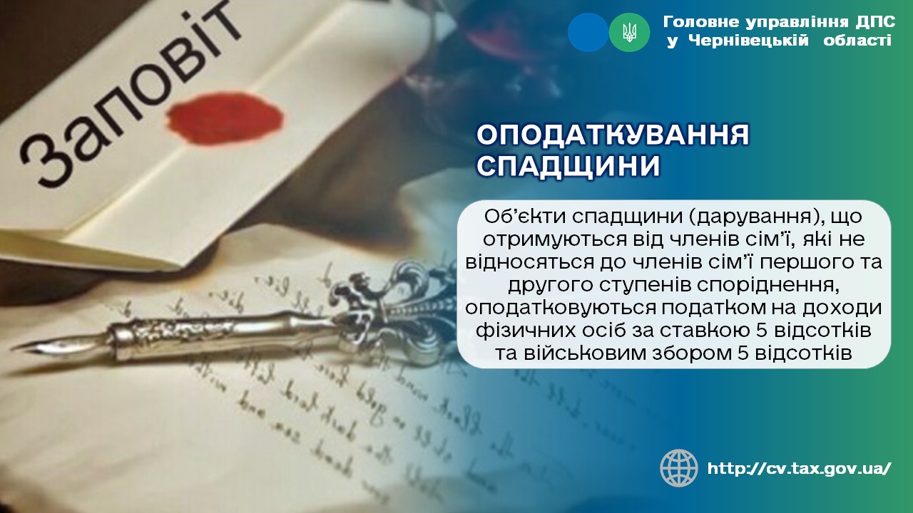 У Головному управлінні ДПС у Чернівецькій області роз’яснюють, як  оподатковується ПДФО дохід у вигляді спадщини (подарунку), отриманий платником податку від ФО - резидента, що отримуються від членів сім’ї, які не відносяться до членів сім’ї першого та другого ступенів споріднення, та за якою ставкою.