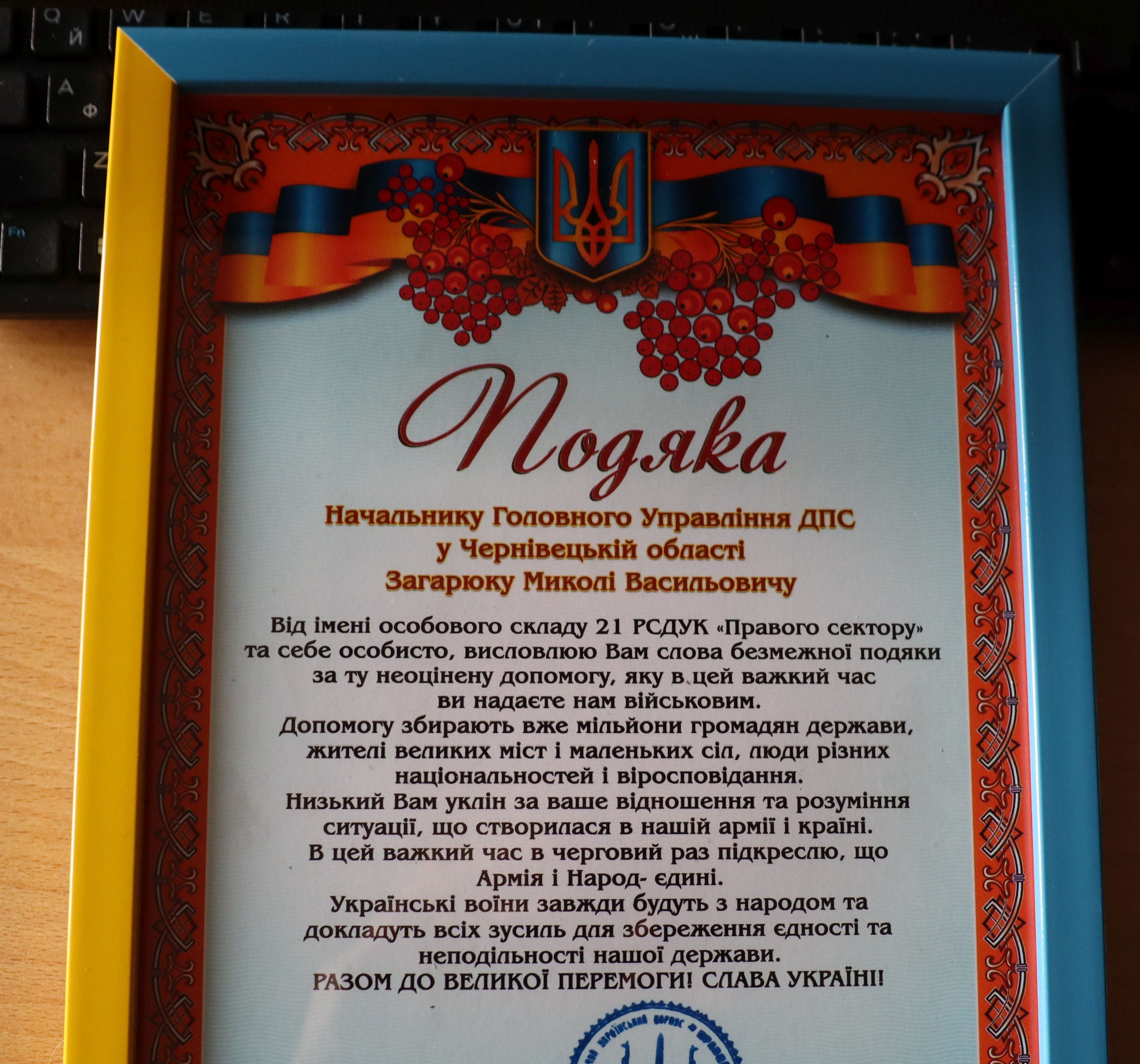 Сьогодні на адресу Головного управління ДПС у Чернівецькій області за допомогу військовим надійшла Подяка від імені особового складу 21 РСДУК «Правого сектору» підписана командиром.
