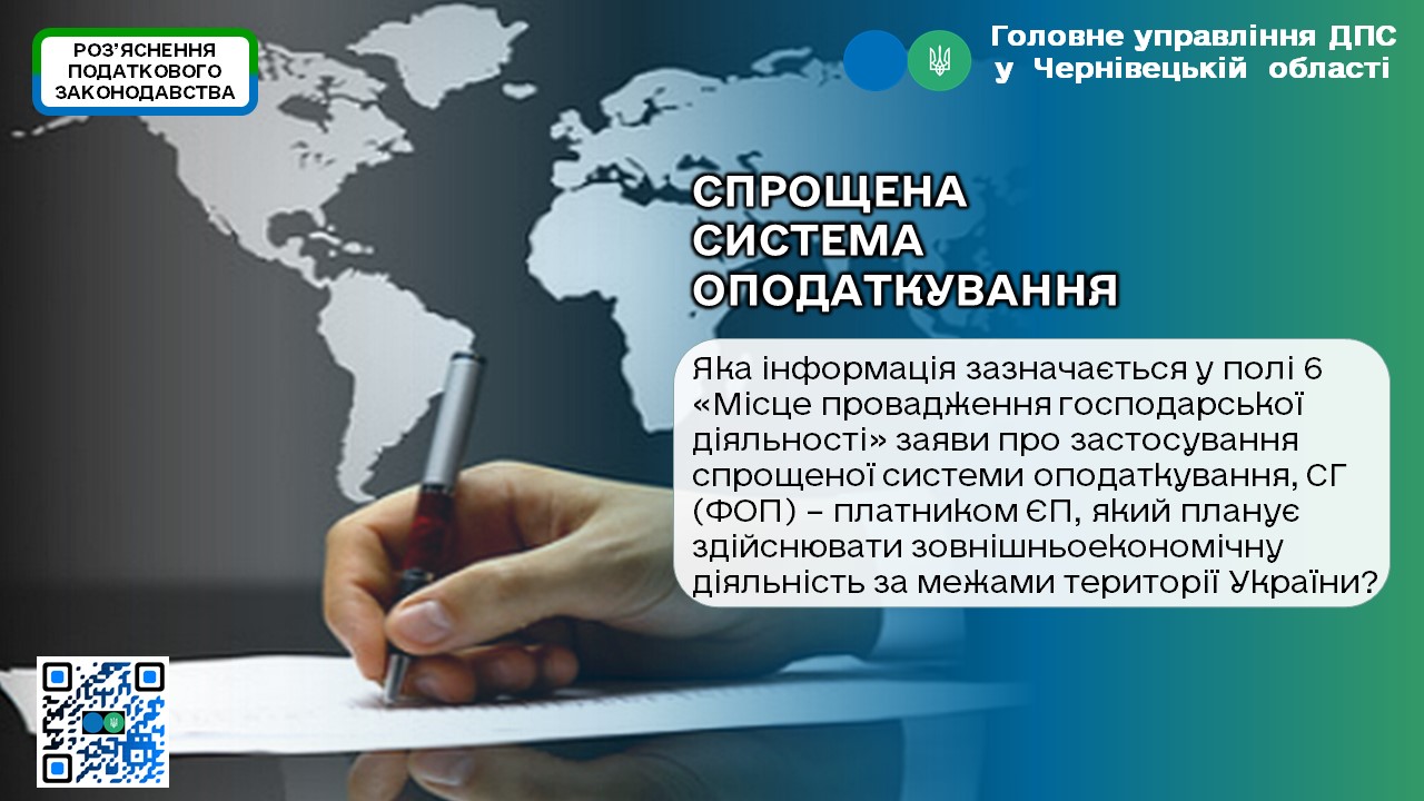 тже, СГ – платник єдиного податку, який планує здійснювати зовнішньоекономічну діяльність повинен у строки, встановлені ПКУ, подати Заяву з позначкою «Внесення змін». При цьому у полі 6 «Місце провадження господарської діяльності», в якому повинна зазначатися інформація, зокрема щодо області, району, населеного пункту, вулиці, номеру будинку/офісу/квартири, індексу, така особа заповнює тільки графу «Область, район, населений пункт», в якій зазначається: «Виконання робіт чи надання послуг за межами України (експорт)» та/або «Поставка товарів за межами території України (експорт)». Інші графи поля 6 Заяви не заповнюються.