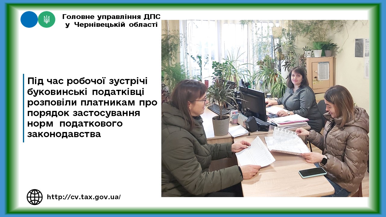 Заступник начальника Кельменецького відділу податків і зборів з фізичних осіб та проведення камеральних перевірок управління оподаткування фізичних осіб Головного управління ДПС у Чернівецькій області Сніжана Ізраілек під час проведення зустрічі з платниками податків розповіла про порядок нарахування та виплати заробітної плати найманим працівникам СГД. Також поінформувала присутніх про порядок заповнення платіжних інструкцій під час розрахунків з бюджетами і фондами. Крім того, ознайомила з роботою «Електронного кабінету» та мобільного застосунку «Моя податкова».