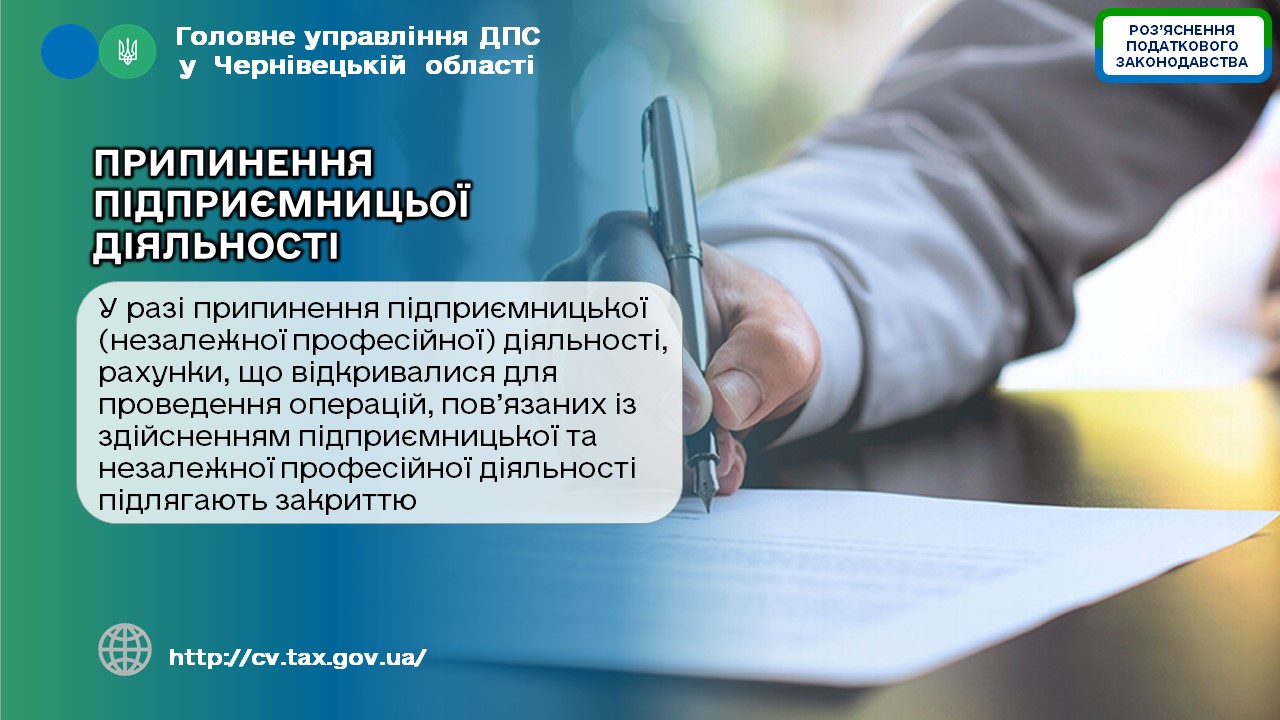У разі припинення підприємницької (незалежної професійної) діяльності, рахунки, що відкривалися для проведення операцій, пов’язаних із здійсненням підприємницької та незалежної професійної діяльності підлягають закриттю