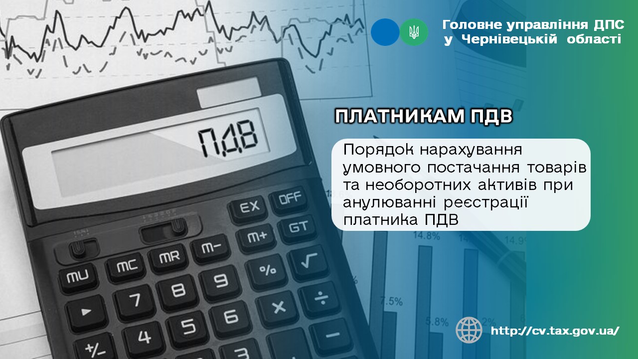 У Головному управлінні ДПС у Чернівецькій області роз’яснюють у яких випадках необхідно визнавати умовне постачання товарів та необоротних активів при анулюванні реєстрації платника ПДВ.