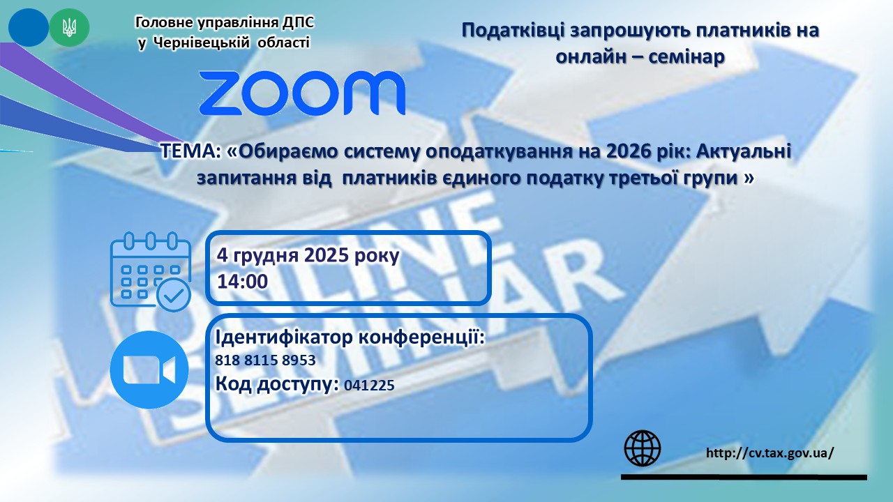 Головне управління ДПС у Чернівецькій області проведе в режимі ZOOM семінар на тему: «Обираємо систему оподаткування на 2026 рік: Актуальні запитання від  платників єдиного податку третьої групи ».