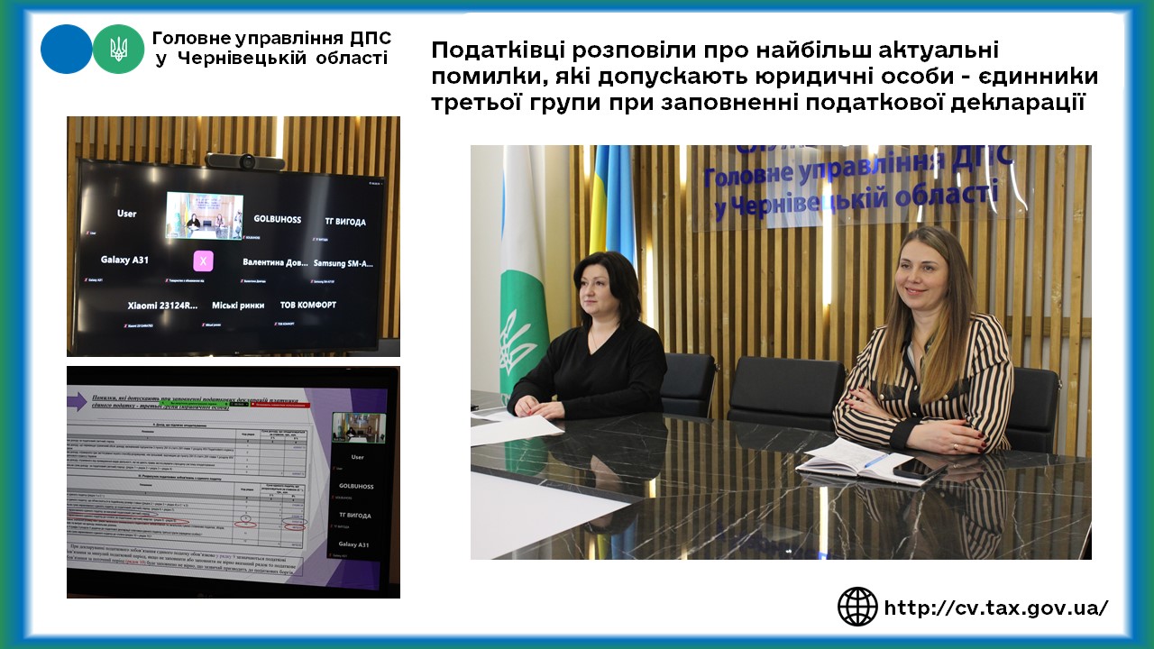Під час проведення онлайн семінару начальник відділу податків і зборів з юридичних осіб у галузях інформації та операцій з нерухомим майном Головного управління ДПС у Чернівецькій області Христина Беженар розповіла платникам податків – єдинникам третьої групи про найбільш поширені помилки, які допускають юридичні особи при заповненні податкових декларацій.