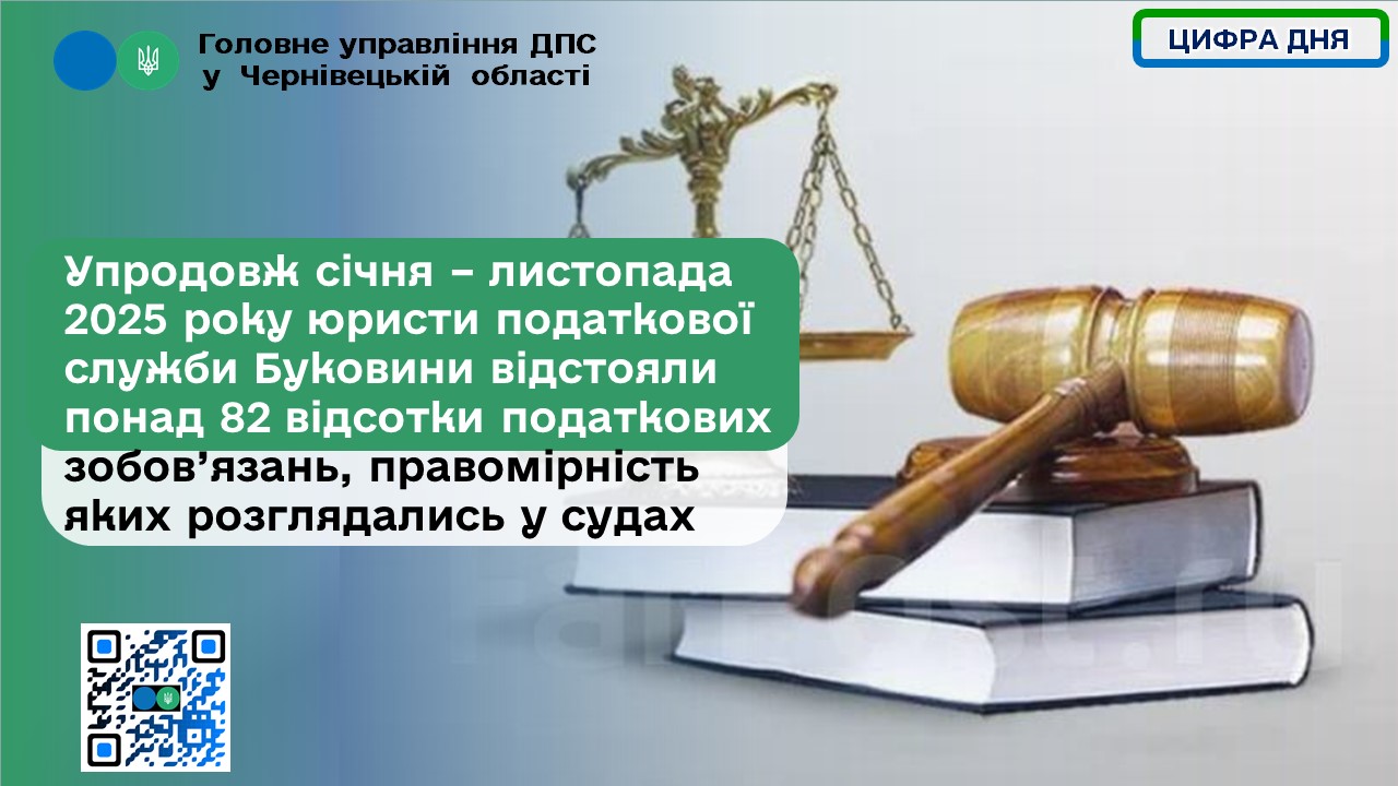 За інформацією фахівців управління правового забезпечення Головного управління ДПС у Чернівецькій області, за одинадцять місяців 2025 року у судах різних інстанцій за участі представників державної податкової служби області розглянуто 783 справи на суму 368,5 млн гривень позовних вимог.
