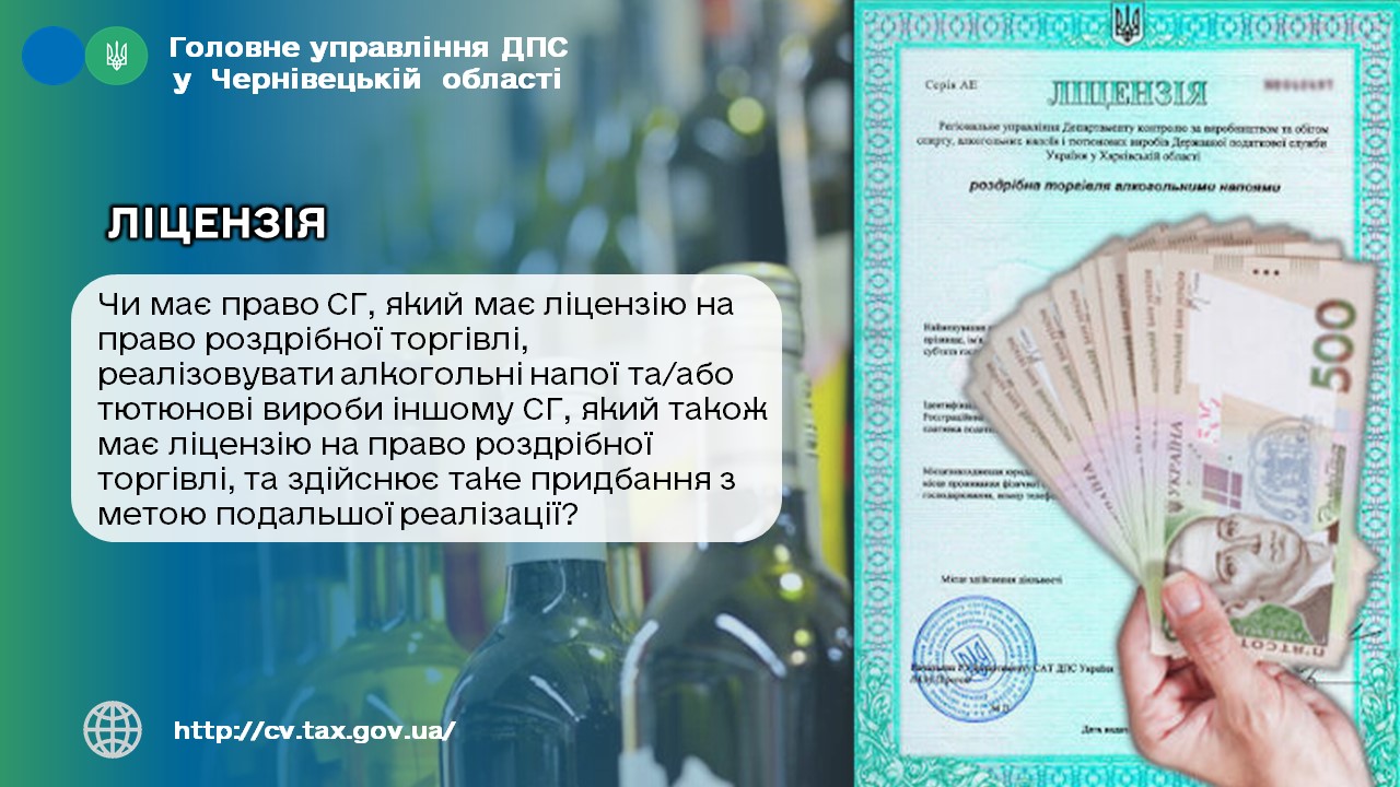 Для реалізації алкогольних напоїв та/або тютюнових виробів іншим суб’єктам господарювання, що здійснюють таке придбання з метою подальшої реалізації, суб’єкту господарювання необхідно отримати ліцензію на право оптової торгівлі алкогольними напоями та/або тютюновими виробами.