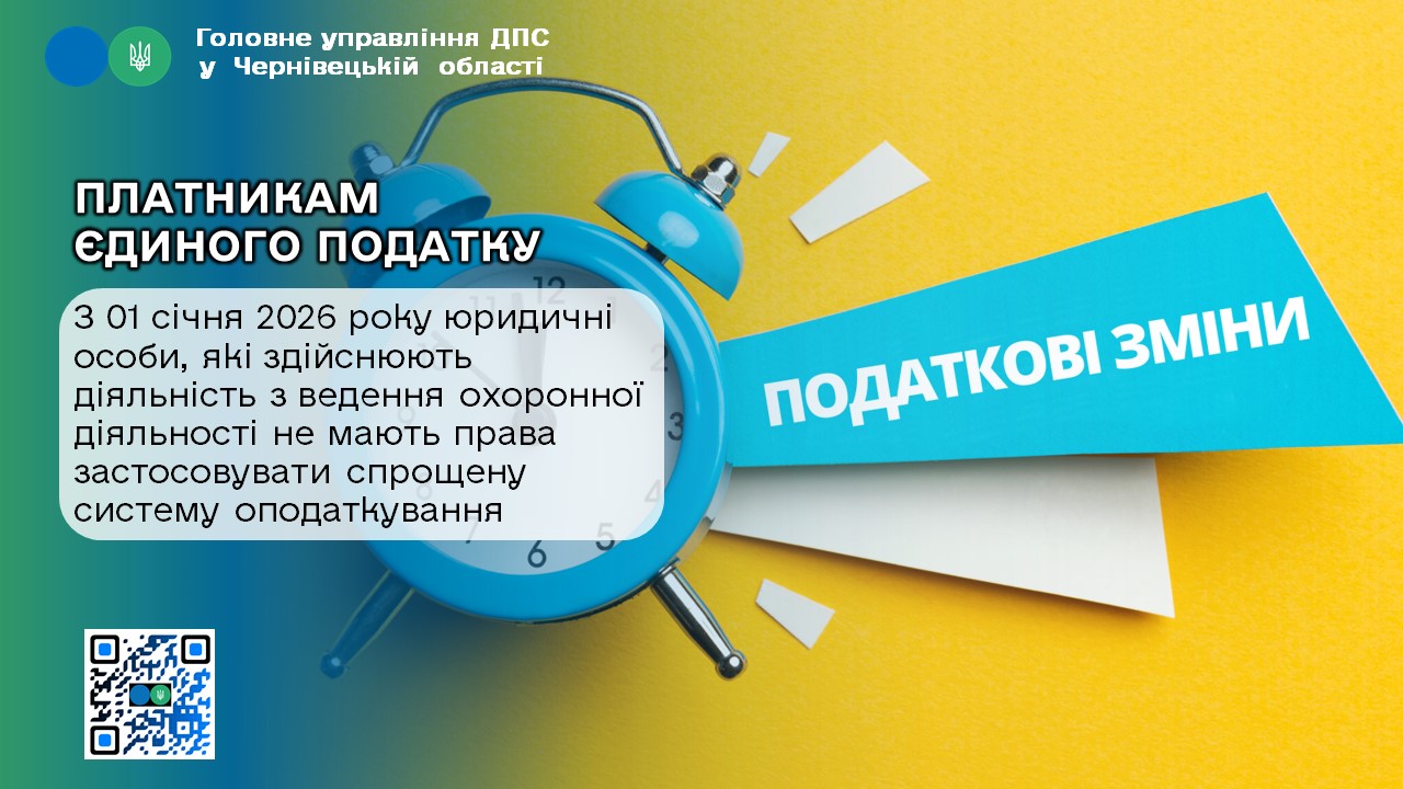 У Головному управлінні ДПС у Чернівецькій області інформують, пунктом 4 закону України від 3 грудня № 4698 - IX «Про внесення змін до Податкового кодексу України та інших законів України щодо особливостей оподаткування банків податком на прибуток підприємств у 2026 році та перенесення строків введення в дію Електронної системи обігу алкогольних напоїв, тютюнових виробів та рідин, що використовуються в електронних сигаретах» внесено зміни до підпункту 219.5.1 пункту 291.5 статті291 Кодексу в частині заборони перебувати на спрощеній системі оподаткування, обліку та звітності підприємствам, основним видом діяльності яких є ведення охоронної діяльності. Цей закон набирає чинності з 1 січня 2026 року.