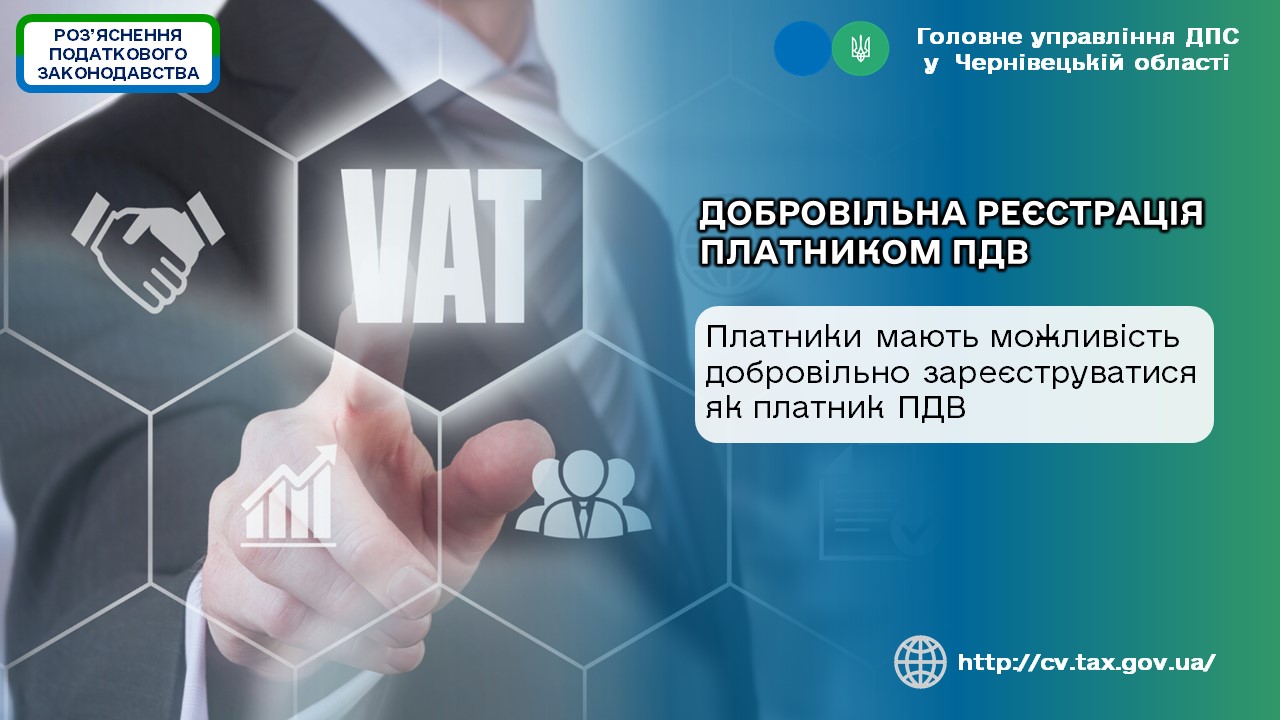 У Головному управлінні ДПС у Чернівецькій області нагадують, згідно з п. 182.1 ст. 182 Податкового кодексу України від 02 грудня 2010 року № 2755-VІ зі змінами та доповненнями (далі – ПКУ) якщо особа, яка відповідно до п. 181.1 ст. 181 ПКУ не є платником податку у зв’язку з тим, що обсяги оподатковуваних операцій відсутні або є меншими від встановленої ст. 181 ПКУ суми (1000000 гривень), вважає за доцільне добровільно зареєструватися як платник податку, така реєстрація здійснюється за її заявою.