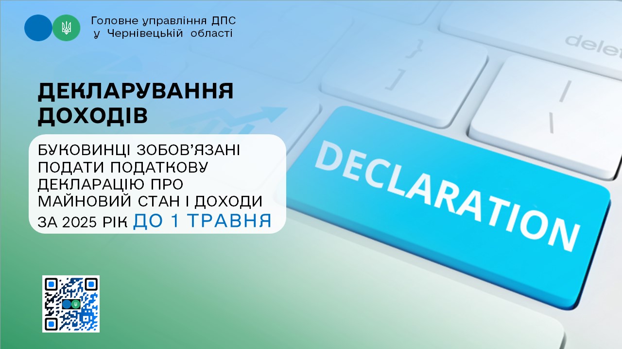 У Головному управлінні ДПС у Чернівецькій області звертають увагу платників податків, відповідно до п.п. 49.18.4 п. 49.18 ст. 49 Податкового кодексу України від 02 грудня 2010 року № 2755-VI із змінами та доповненнями (далі – ПКУ), податкова декларація про майновий стан і доходи (далі – Декларація) подається за базовий звітний (податковий) період, що дорівнює календарному року для платників податку на доходи фізичних осіб, у тому числі самозайнятих осіб – до 1 травня року, що настає за звітним, крім випадків, передбачених розд. IV ПКУ.