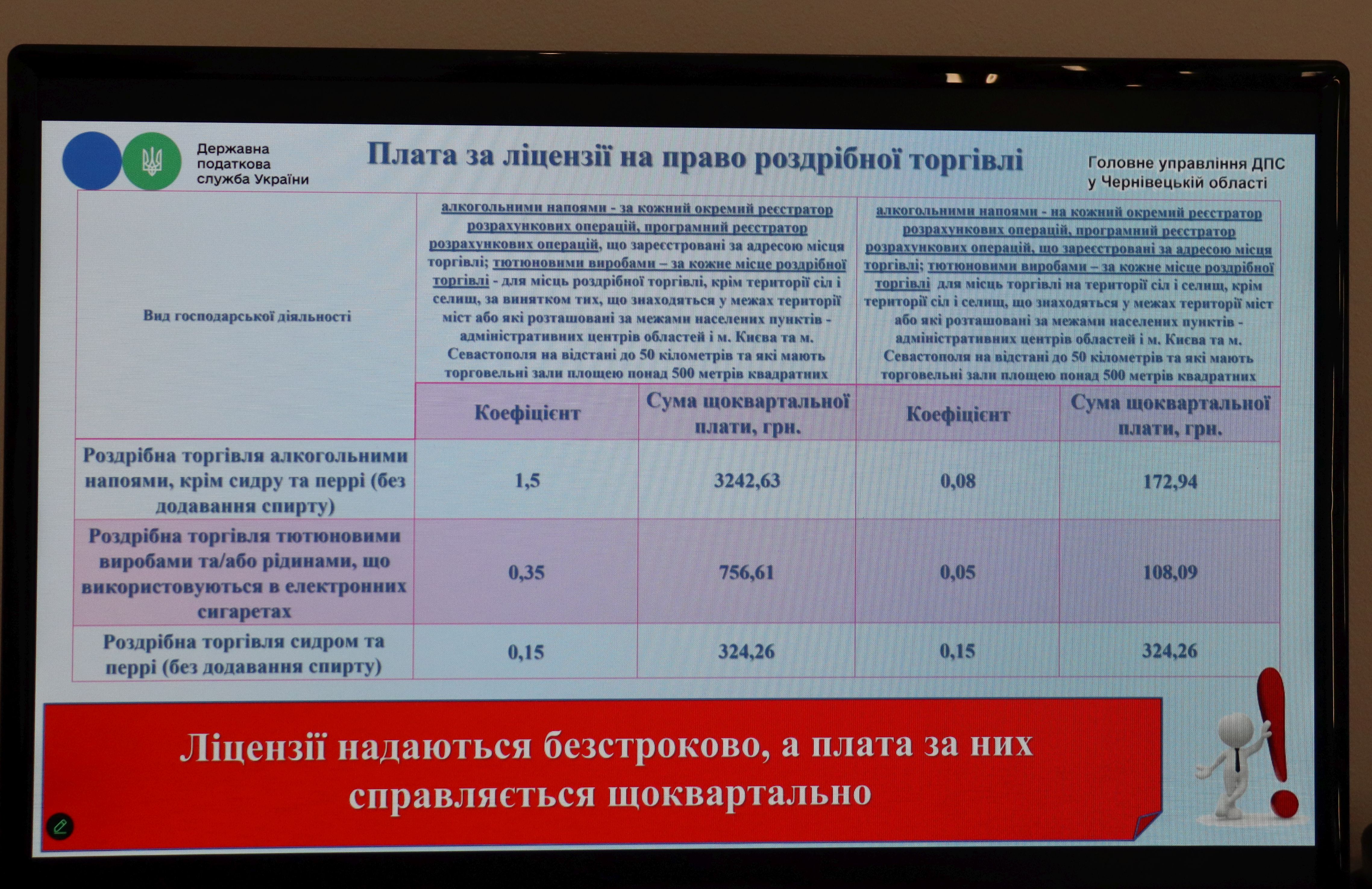 Олексій Цибко у своєму виступі зауважив, що з 1 жовтня 2025 року нові вимоги щодо середньої заробітної плати та мінімального доходу: для ліцензіатів, що отримали ліцензію на право роздрібної торгівлі підакцизними товарами має становити не менше 2 розмірів мінімальної заробітної плати, встановленої законом на 1 січня звітного (податкового) року, за умови, що суб’єкти господарювання торгують підакцизними товарами в межах обласних центрів до 50 км.