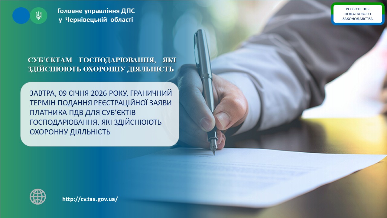 Завтра, 09 січня 2026 року, граничний термін подання реєстраційної заяви платника ПДВ для суб’єктів господарювання, які здійснюють охоронну діяльність