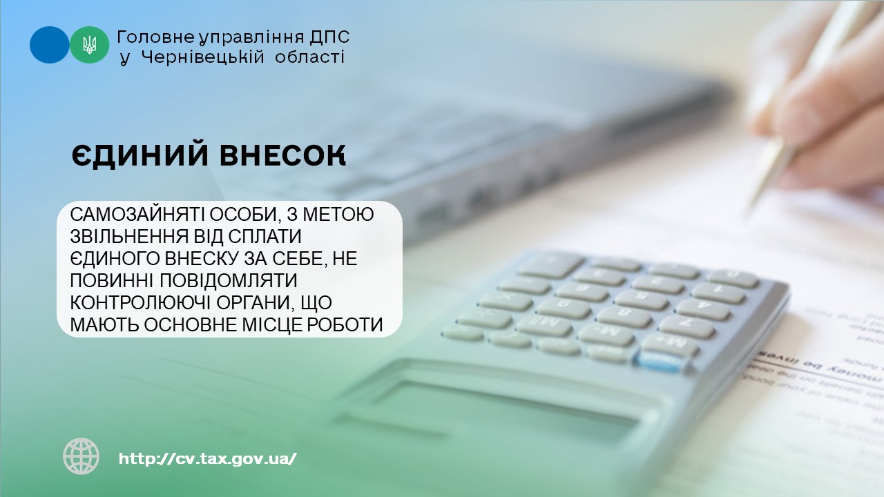 У Головному управлінні ДПС у Чернівецькій області роз’яснюють чи повинні самозайняті особи, з метою звільнення від сплати єдиного внеску за себе, повідомляти контролюючі органи, що мають основне місце роботи, де за них було сплачено страховий внесок у розмірі не менше мінімального.