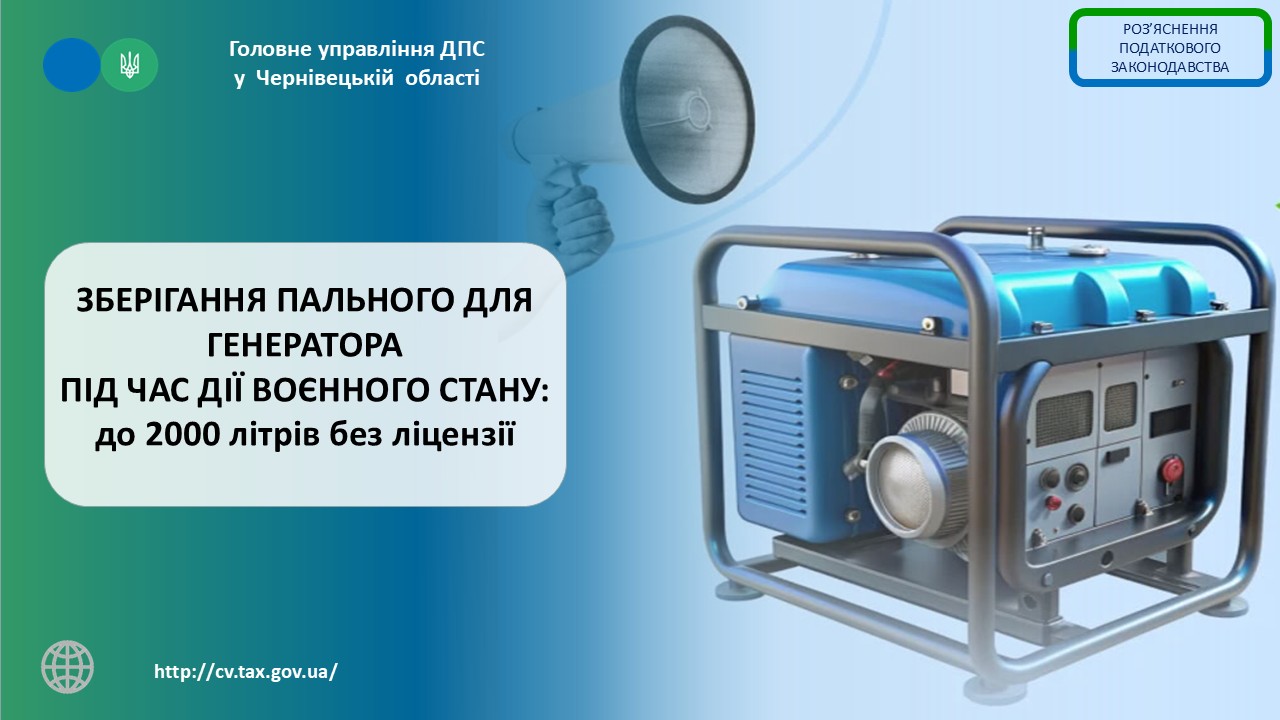 Фахівці управління контролю за підакцизними товарами Головного управління ДПС у Чернівецькій області наголошують, що на період дії воєнного стану в Україні та протягом 30 днів після його припинення або скасування для суб’єктів господарювання діють спрощені правила зберігання пального для заправлення електрогенераторних установок.