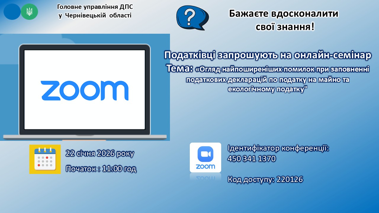 Головне управління ДПС у Чернівецькій області проведе в режимі ZOOM семінар на тему: «Огляд найпоширеніших помилок при заповненні податкових декларацій по податку на майно та екологічному податку».